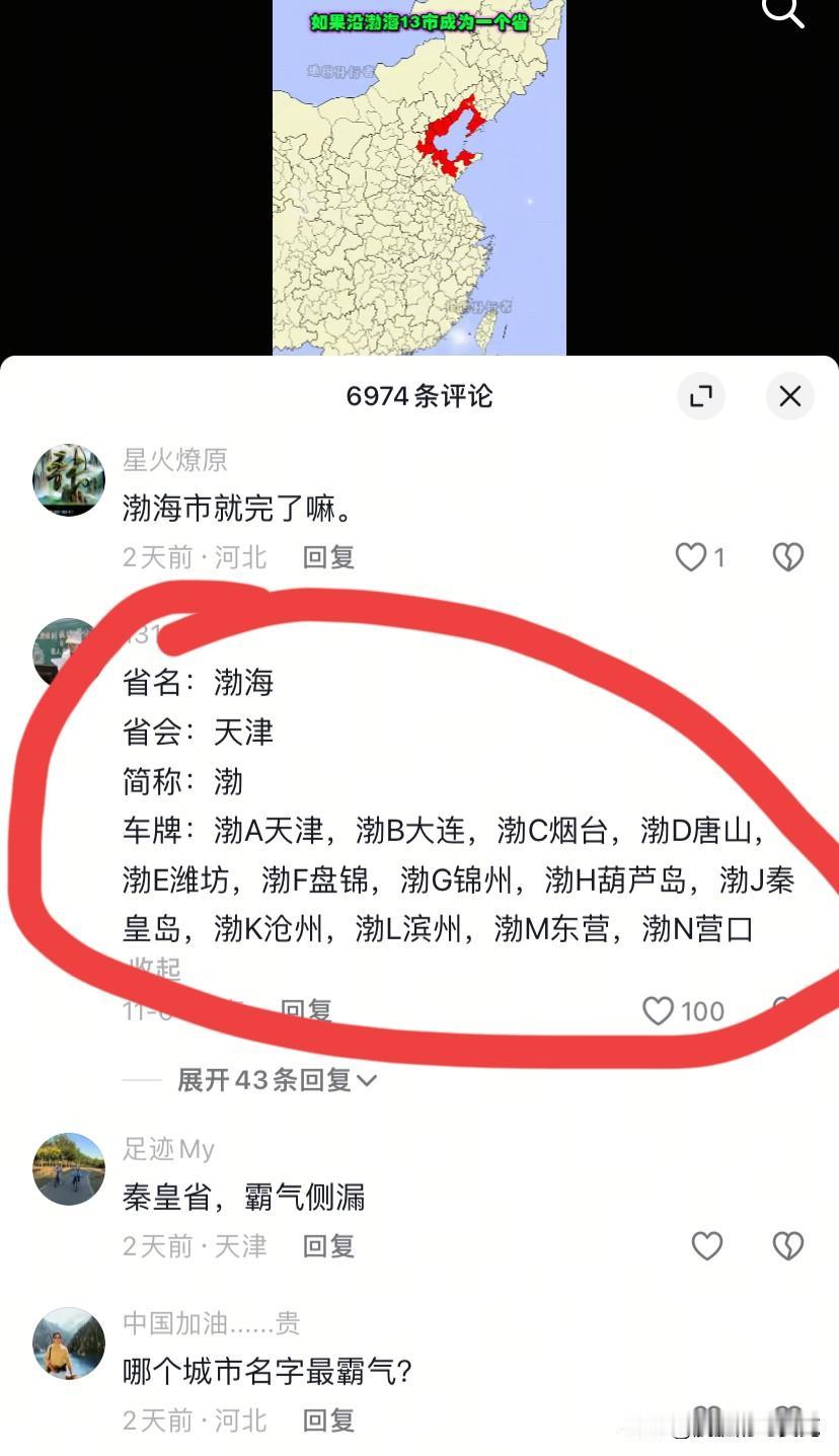 有人提议把环渤海城市改成一个省? 不可能,别想了,这是北方的精华地区,这要是成为一个省,那别的省份还怎么混,相当于南方把长三角和珠三角合并为一个省。 省名:渤海 省会:天津 简称:渤 车牌:渤A天津,渤B大连,渤C烟台,渤D唐山,渤E潍坊,渤F盘锦,渤G锦州,渤H葫芦岛,渤J秦皇岛,渤K沧州,渤L滨州,渤M东营,渤N营口