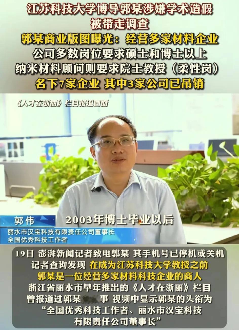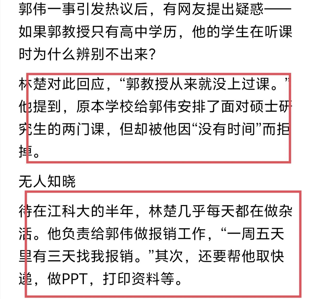 林楚对导师郭伟的第一印象挺好,他矮矮胖胖的,1米6左右的个子,讲话还带点幽默,相处起来还是挺轻松的。他只知道郭伟对外称自己今年四十九岁,林总不知道他是哪里人,其他方面的信息也一无所知。 林楚曾经在网上查过老师的信息,包括证书,论文全都是查无实处。郭伟的解释是我是从国外引进回来的人才,不想在网上留一丝痕迹,为了的自身安全。学校给郭伟安排了两门研究生的课,但他都拒绝去上,理由是自己没时间。这样郭伟在江科大混了两年多,还骗得了千万的经费。林楚听到导师郭伟的骗局被揭穿,一点都不感到意外。只是觉得自己浪费了这一年多的时间,到现在博士还没毕业。