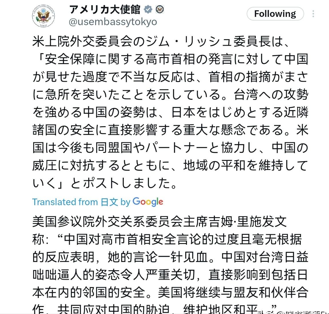 美国国内有人安奈不住了!11月21日,美国参议院外交关系委员会主席吉姆·里施发文声称:中国对高市首相安全言论的过度且“毫无根据”的反应表明,她的言论一针见血。中国对台湾日益“咄咄逼人”的姿态令人严重关切,直接影响到包括日本在内的邻国的安全。美国将继续与盟友和伙伴合作,共同应对中国的胁迫,维护地区和平。 很显然,在我们持续对高市早苗施加压力之后,美国国内终于有人是坐不住了,因此公开出来挺高市早苗。不过,何为中国反应“毫无根据”,我们给高市早苗指了明路,为什么高市早苗不撤回呢?美国政坛对华鹰派的策略,我们是非常清楚的,那就是利用日本,台湾,遏制我们。所以,才会默许“台独”分子,纵容日本军国主义者。 要理解这份焦灼感从何而来,就必须回溯到事件的起点。高市早苗此前究竟说了什么,能引发如此大的波澜?她公开宣称“台湾有事就是日本有事”,并强调日本必须为可能的冲突做好准备,甚至讨论了拥核的可能性。 这些言论,在任何一个主权国家看来,都远远超出了正常政治评论的范畴,直接触碰了最核心的红线。这已经不是简单的“关切”,而是赤裸裸的干涉和挑衅。 面对这样的言论,任何一个负责任的政府都不可能保持沉默。因此,中方通过外交渠道和公开声明,明确表达了严正立场,要求日方澄清并纠正错误言论。 这种反应,在任何一个主权国家的标准操作手册里,都算是克制的、有理有节的。然而,在吉姆·里施的口中,这种正当的反应却被扭曲成了“毫无根据”的“过度”反应。 更有意思的是,里施在声明中特意强调,中国的反应“恰恰证明”了高市早苗的言论是正确的。这种逻辑堪称奇妙,仿佛一个人在你家门口挑衅,你出来理论,反而成了你理亏的证据。 这种“倒打一耙”的叙事手法,恰恰暴露了美国部分政客的真实意图:他们并非真的关心事实真相,而是要预设一个“中国威胁论”的剧本,然后将所有事件都强行塞进这个框架里。 高市早苗的言论,无论多么出格,只要符合这个剧本,就会被塑造成“勇敢的真相”;而中方的任何反应,无论多么合理,都会被贴上“胁迫”和“咄咄逼人”的标签。 这背后,其实是一条清晰的策略脉络。美国将中国视为最主要的战略竞争对手,这一点早已不是秘密。为了实施围堵和遏制,美国需要一个强大的“前线盟友”,而日本,凭借其地理位置和综合国力,无疑是最佳人选。 近年来,美国不断鼓励日本突破和平宪法的限制,增加军费,在地区安全事务中扮演更积极的角色。在这种默许甚至纵容的氛围下,日本国内一些右翼和军国主义思潮开始沉渣泛起。 高市早苗的激进言论,正是这种思潮的体现。她或许以为自己是在为日本“发声”,却没意识到,她的言论正中美国下怀,成为了美国推动其印太战略的一枚棋子。 当中国对这枚棋子的越界行为进行反制时,棋手自然要出面保护。吉姆·里施的火速下场,正是这种保护行为的体现。 他不仅是在为高市早苗个人撑腰,更是在向日本政坛释放一个明确的信号:放心大胆地往前走,只要是对着中国的,华盛顿都会在背后支持你们。 这种做法,无疑会进一步刺激日本国内的激进势力,让他们误判形势,认为可以仗着美国的支持而无所顾忌。这对于地区的和平与稳定,绝不是什么好兆头。 整个事件就像一场精心编排的戏剧。高市早苗抛出极具争议的言论,是第一幕;中方做出严正回应,是第二幕;美国高层亲自下场“灭火”,并将水搅浑,是第三幕。 每一环都扣得很紧,最终目的都是为了将中国描绘成一个破坏地区和平的“麻烦制造者”。而真正在背后煽风点火、试图打破地区力量平衡的推手,却把自己包装成了“维护和平”的正义角色。 这场围绕台海的风波,因为美国高层的直接介入,变得更加复杂。言语的交锋背后,是各方战略意图的激烈碰撞。未来,这种互动模式会成为常态吗?地区和平的平衡点又在哪里?这或许值得我们每个人深思。