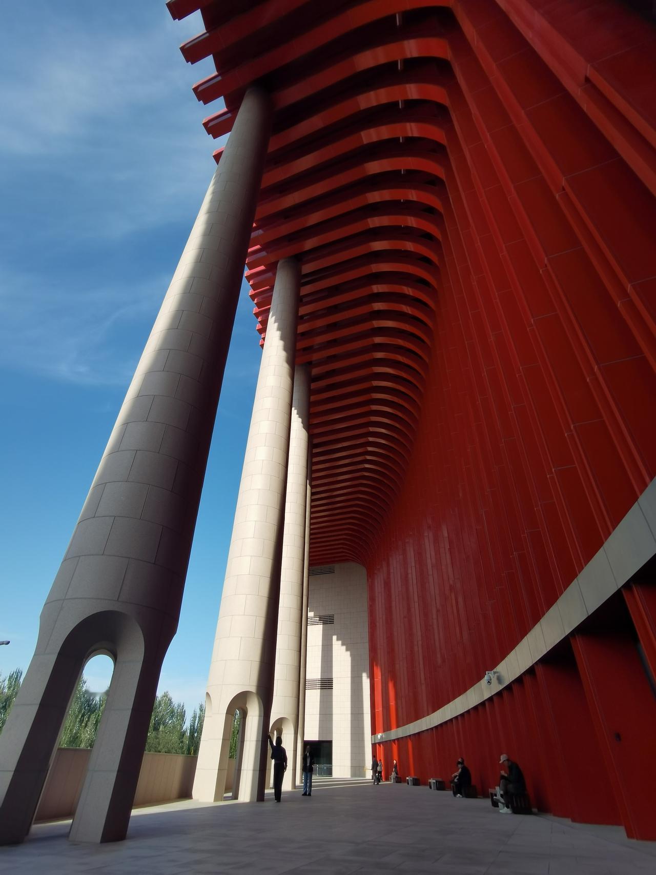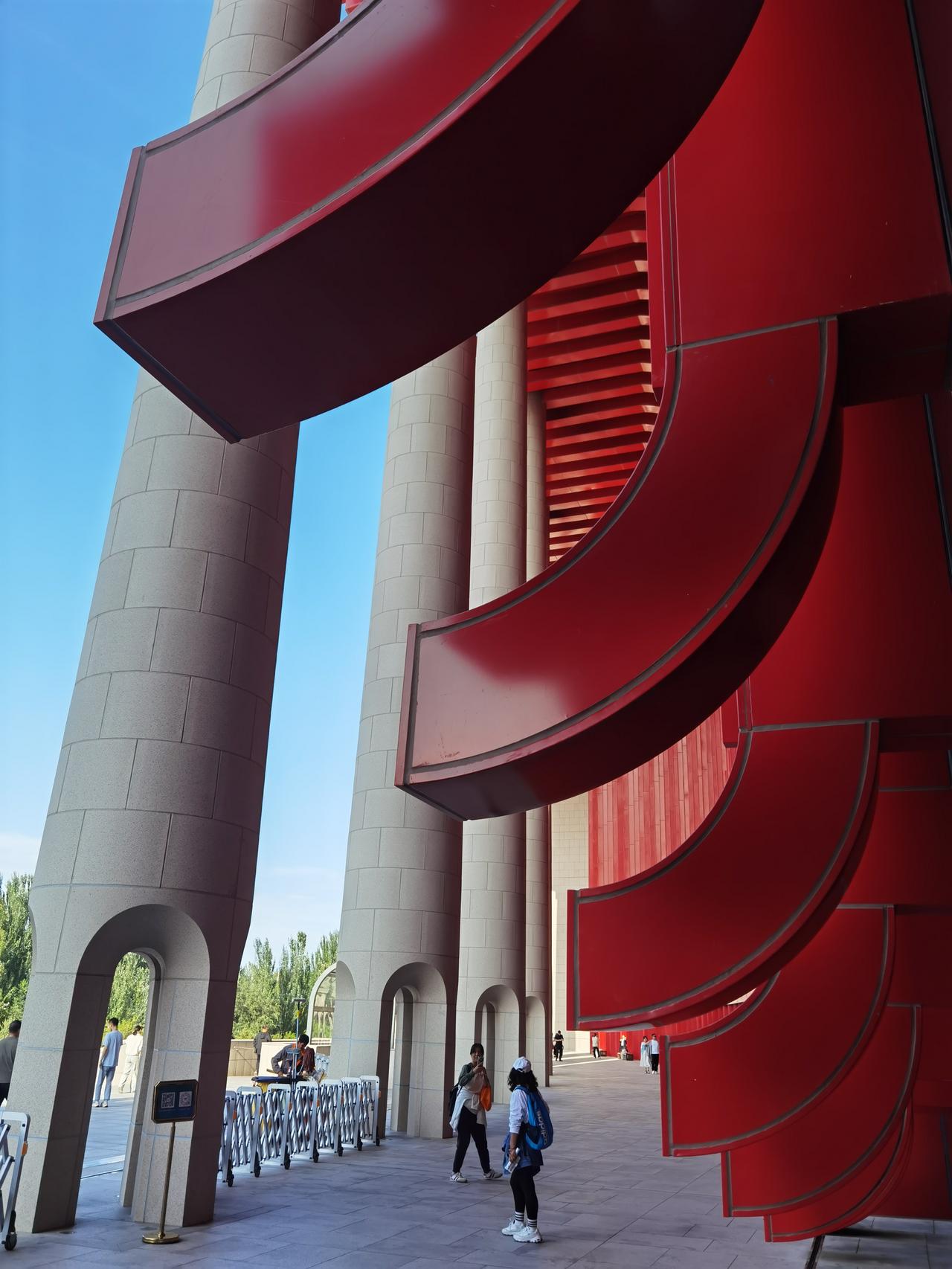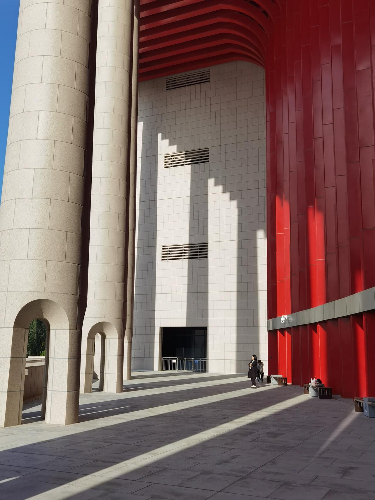 国内省级博物馆基本都去过了,感觉内蒙古博物院是全国博物馆外形最美的。 内蒙古博物院的外形融合了草原文化元素与现代建筑理念,兼具文化内涵与视觉美感。其建筑采用新中式古典风格,正面22根灰白色巨型石柱并排而立,串联成走廊,撑起整个建筑的轮廓。建筑外立面采用红色主色调,反应出蒙古族对红色的崇尚,寓意温暖、活力与延续,在视觉效果上也极具冲击力。下午四点左右拍照最理想,光线斜射会形成美丽的光影。 如果是外地的游客,建议在呼和浩特东站下车,步行去很方便,行程十多分钟即到。车站出来到王府井奥莱,路边有一个人行过街天桥,下桥就看到内蒙古博物院了。
