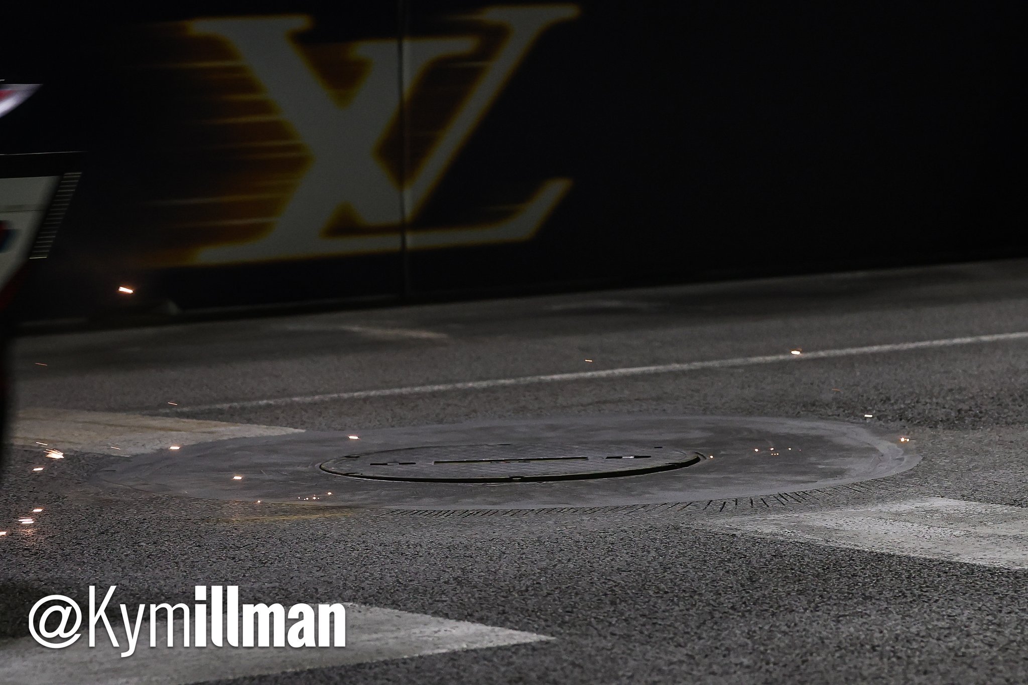 F1赛车强大的吸力造成井盖松动,这是二练最后20分钟出现两次红旗的原因。前方记者Kym Illman提供的图片能看到前后的差异。万幸没有赛车因此受损