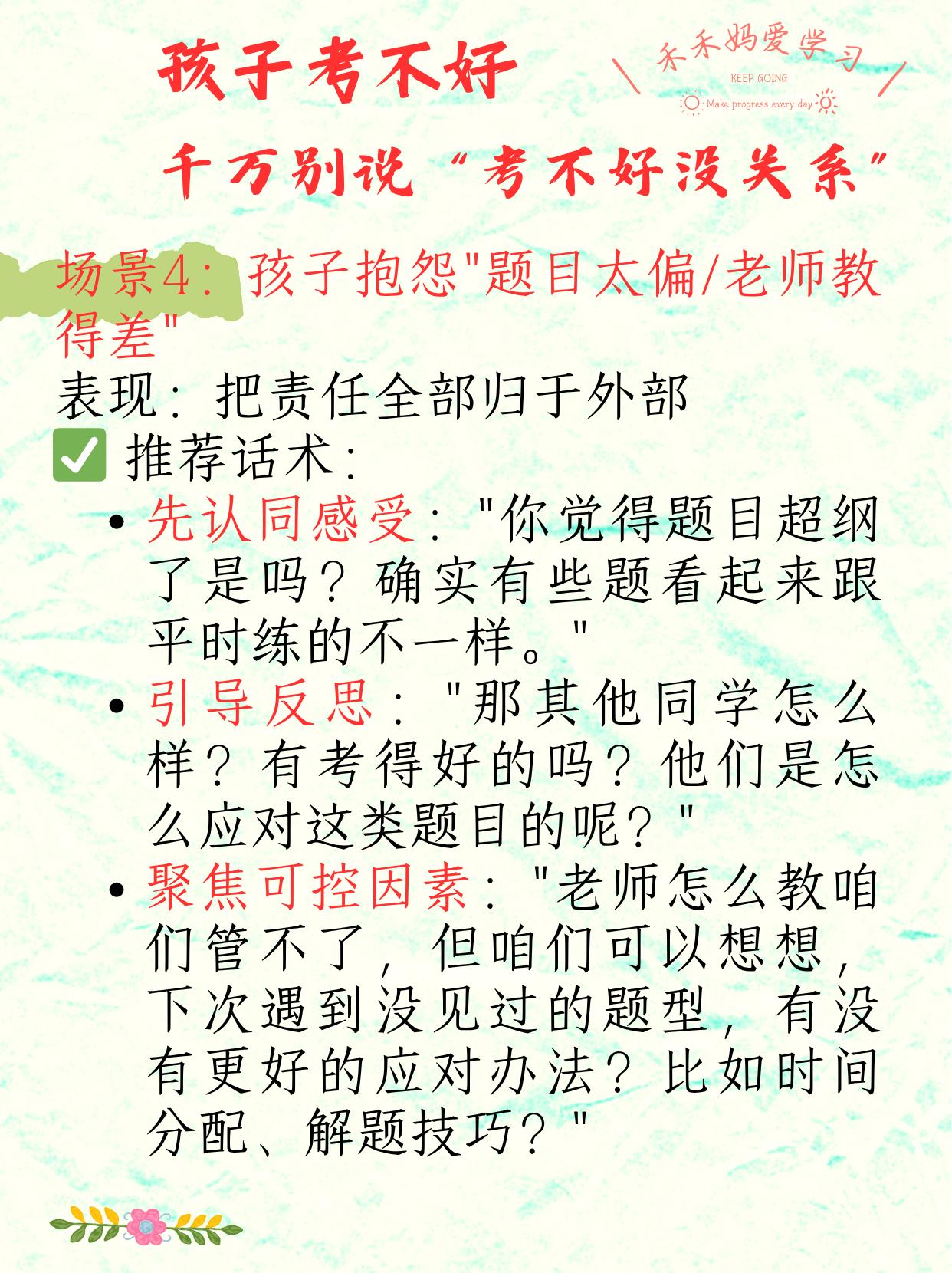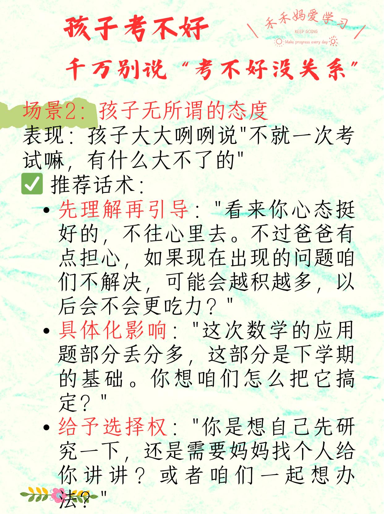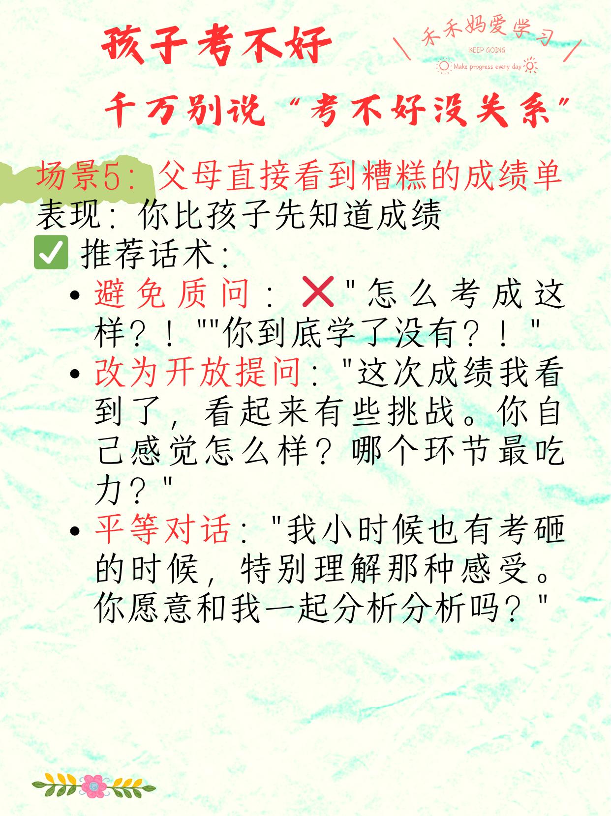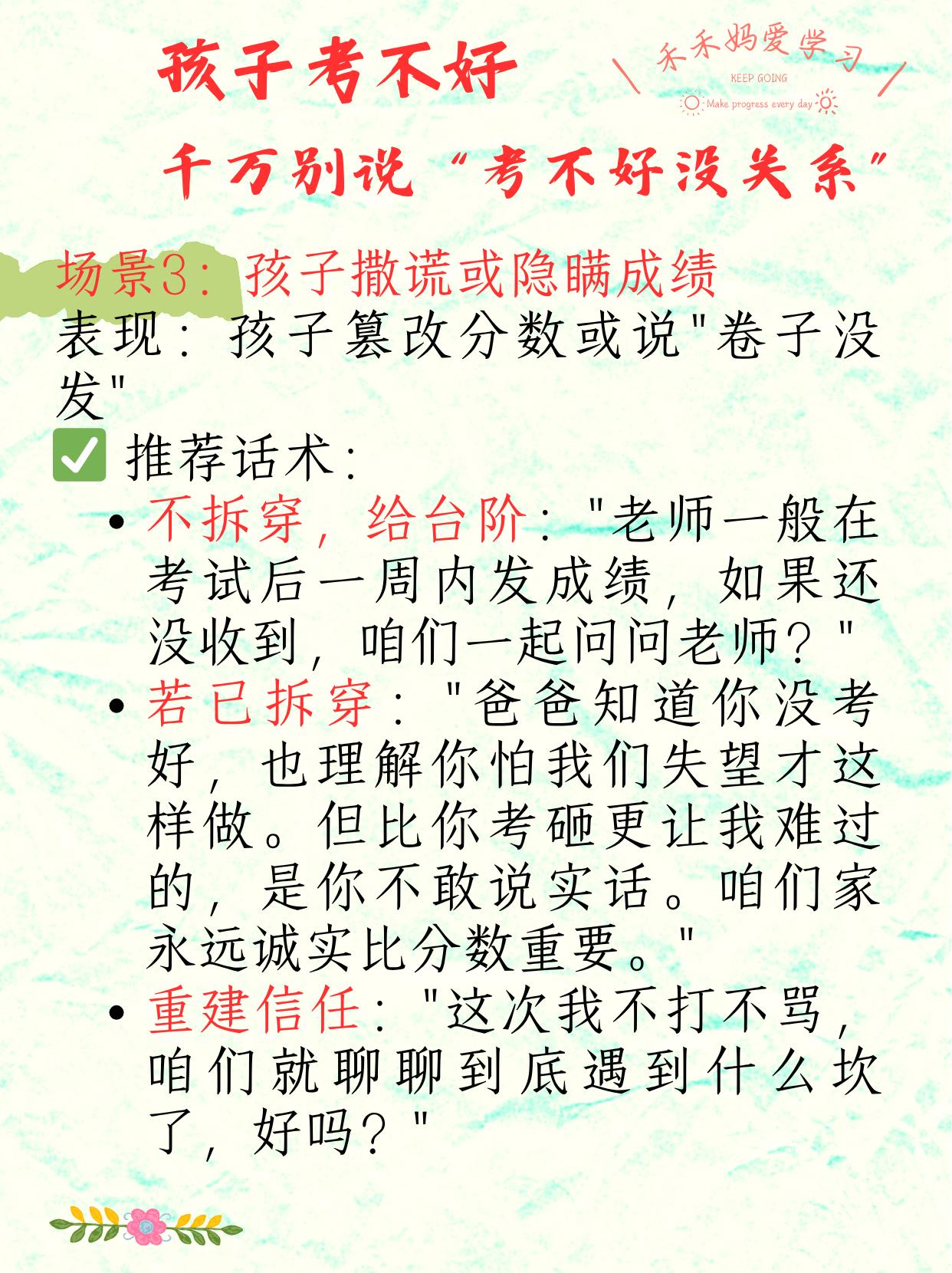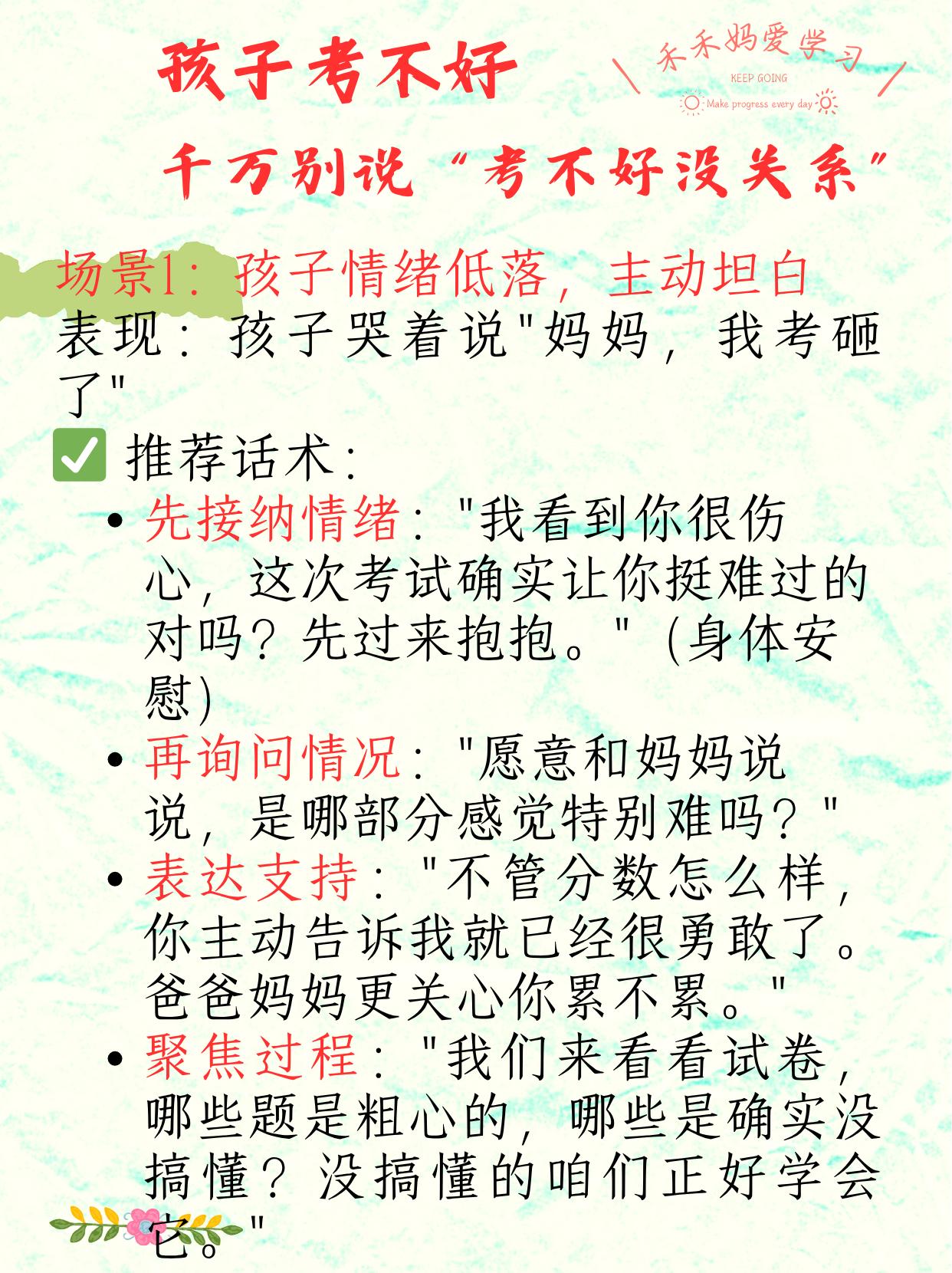 期中考试成绩已出,你家孩子考的咋样?当孩子考试成绩不理想时,父母的沟通方式至关重要,不仅会影响孩子未来的学习动力,更会影响亲子关系。 以下几张图,是孩子成绩不理想,常见场景及具体话术,原则就是先链接感情,再纠正行为,让孩子感受到“父母在意的是我,而不是我的成绩”,这样做不仅能激发孩子的内在学习动力,更有利于亲子和谐。 建议各位家有中小学生的父母,收藏起来认真看一看,为后续与孩子沟通做个准备。
