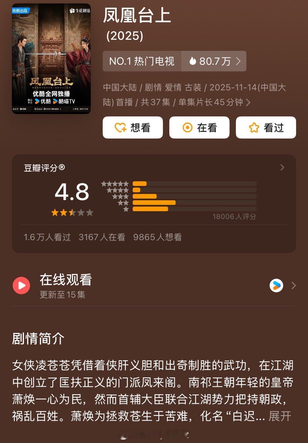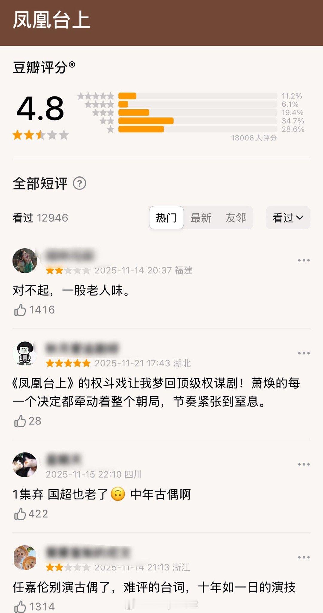 任嘉伦、彭小苒主演的《凤凰台上》豆瓣开分4.8,大多数人打了一星和二星,国超又扑