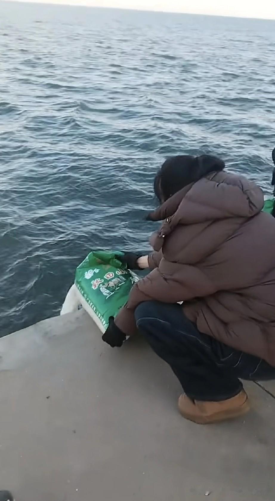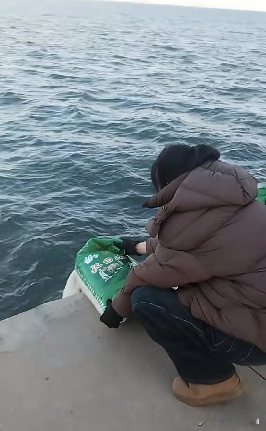 傍晚时分,一名女子在海边散步,瞧见围栏外有一群人正用剪子剪开一袋袋大米,将其倒入