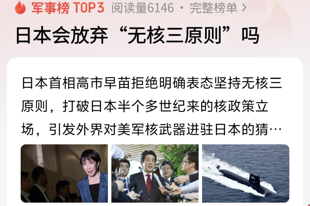 日本会不会放弃“不拥有、不生产、不引进”核武器的“无核三原则”?现在看来,这条坚持了快70年的规矩,可能要松动了。 为啥这么说? 目前日本政坛现在有不少人公开说,可以讨论“引进核武器”的事。比如高市早苗这样的重要人物,就说“不引进”这一条,不是铁板一块,可以商量。而且日本计划在2026年重新制定国家安全战略,到时候很可能不再把“无核三原则”当成硬规矩写进去。 日本想靠美国的核武器来“保护”自己,特别是面对朝鲜、中国这些有核国家。他们现在提“核共享”,意思就是让美国把核弹头存在日本,战时由美军控制,但基地在日本。这样一来,日本虽然没自己造核武器,但已经变成“有核国家”的前线了。 日本早就有造核武器的技术和材料,真想搞,几年就能成。现在民间也有越来越多的人觉得,光靠“和平”口号不安全,得有点“硬家伙”。 但完全放弃“无核三原则”还是很难。国内有反核传统,国际上也会被骂,尤其是中国、韩国肯定强烈反对,美国也可能担心局势失控。 所以最可能的情况是,嘴上还说着“我们不要核武器”,但实际行动上,默许美军把核武器放进日本,让原则变成“摆设”。 实际就是“明面上不要,暗地里不拦”。