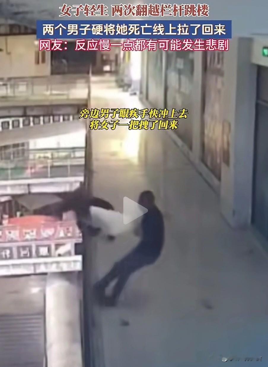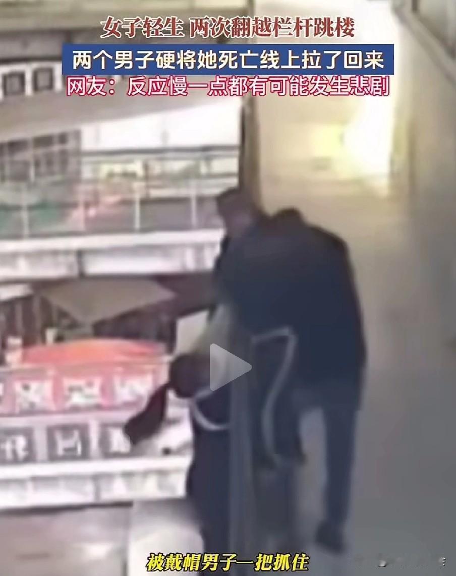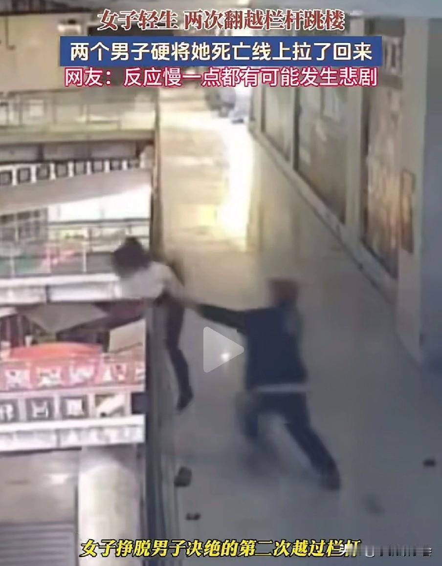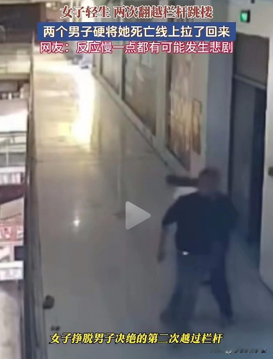但凡晚一秒,悲剧就可能发生。 一男子在走路时,看出了美女的异常,果不其然,美女毫不犹豫地翻过栏杆,准备一跃而下,要知道这楼很高,掉下去肯定是九死一生。 男子眼疾手快,一把抓住了美女的一只胳膊,这个时候来了一个戴帽子的男子,二人合力把美女拉了上来。 上来后的美女情绪还很激动,二人正劝解时,美女趁着二人不备,再一次做出来跳楼的动作,动作很快,还好戴帽男子拽住了美女的一只胳膊。 在众人的合力下,美女又一次被他们从死亡线上拉了回来。这一次,男子死死搂住美女,生怕她再一次去跳楼。 还好两位男子眼疾手快,否则美女掉下去,肯定会危及生命。 为两位男子点赞!跳楼事故 高楼坠楼 跳楼事故 坠楼故事 高楼坠楼 美女坠楼