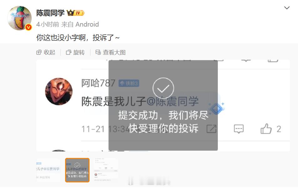 陈震已经把这条转发的删了,还投诉提交了别人的评论。我始终没明白,这个千万大V的人设是怎么立起来的。。。