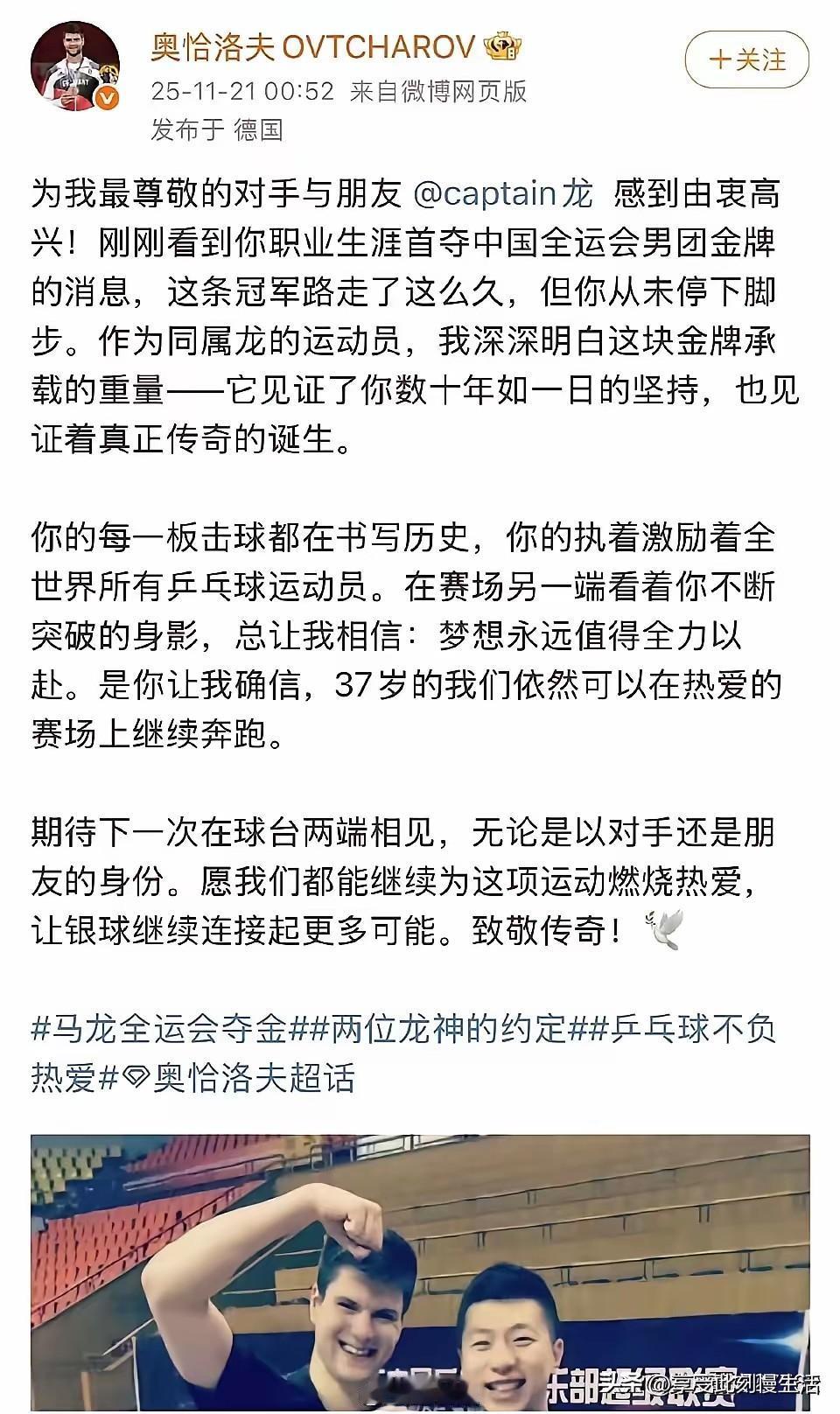 马龙全运会男团夺冠,低调发微博简简单单六个字“完美谢谢大家”。然而马龙的外协护法好友奥恰洛夫却为马龙洋洋洒洒的写了很长的一篇文章。 奥恰洛夫说:为我最尊敬的对手和朋友马龙感到由衷的高兴。刚刚看到你职业生涯首夺中国全运会男团金牌的消息。这条冠军路走了很久,但你从未停下脚步。奥恰洛夫都说这条冠军路走了很久。可见王楚钦和黄友政跟着马龙拿到全运会男团冠军有多幸运。 奥恰洛夫说他深深知道这块金牌的承载的重量。它见证了马龙数十年如一日的坚持。也见证着真正传奇的诞生。 奥恰洛夫说37岁的马龙执着的精神激励着全世界所有乒乓球运动员继续在热爱的赛场上奔跑。 奥恰洛夫说期待下次和马龙在球台的两端相见,无论是以朋友还是对手的身份。让银球连接更多可能。真没想到奥恰洛夫的文笔这么好。 得冠军的简简单单,为他祝福的却洋洋洒洒。可见是由衷的为马龙感到高兴,大抵只有真朋友才会这样吧!
