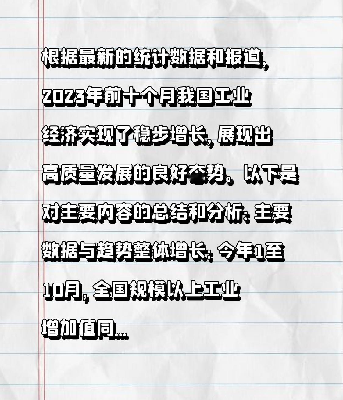 工业经济高质量发展扎实推进(锐财经) 根据最新的统计数据和报道,2023年前十个月我国工业经济实现了稳步增长,展现出高质量发展的良好态势。以下是对主要内容的总结和分析: 主要数据与趋势 整体增长:今年1至10月,全国规模以上工业增加值同比增长6.1%,高于去年同期0.3个百分点,显示工业生产持续向好。 10月份表现:工业生产保持稳中有进的态势,绝大多数行业和产品实现增长。剔除季节因素后,环比增长0.17%,表明工业生产的韧性较强。 行业结构优化:产业结构不断优化升级,新质生产力(如高技术和装备制造业)得到培育壮大,产业链供应链的稳定性增强。 行业表现 制造业:10月份制造业增加值同比增长4.9%,是工业增长的主要动力之一。 其他行业:采矿业、电力、热力、燃气及水生产和供应业也表现良好,支持整体工业稳定发展。 高质量发展特点 产业升级:产业结构持续优化,装备制造业和高技术制造业快速发展,体现出由传统制造向高端制造转型的趋势。 新质生产力:新兴产业和创新驱动成为工业增长的重要引擎,为未来工业发展提供新动力。 未来展望 扎实推进:工业高质量发展仍是未来重点,将继续推动技术创新、产业升级和绿色低碳发展。 政策支持:政府将继续落实稳增长、促转型的政策措施,激发企业创新活力,巩固工业增长基础。 结语 整体来看,2023年前十个月我国工业经济实现了稳中有进、质量提升的良好局面,为经济持续健康发展提供了坚实支撑。未来,随着科技创新和产业升级的深入推进,工业高质量发展有望取得更加显著的成效。 如果你需要更详细的数据分析或具体行业的情况,也可以告诉我!