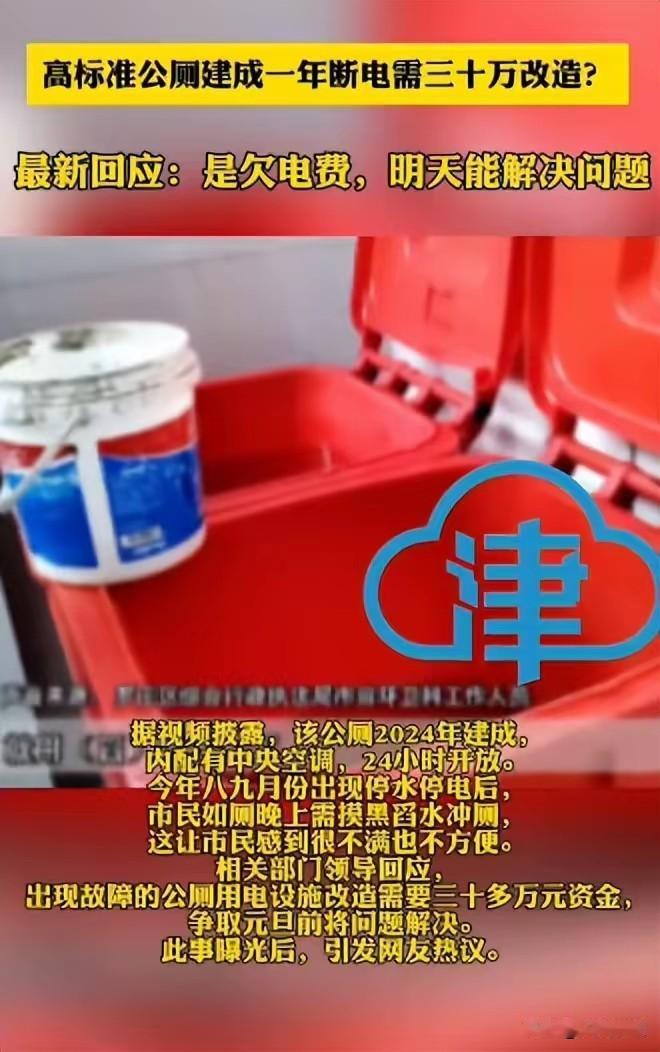 山东临沂罗庄区去年刚建好一座高标准公厕,本来设施挺全还带中央空调,承诺24小时开放,结果今年八九月份就闹起了停水断电的事儿。市民去如厕,晚上得摸黑找路,想冲厕还得自己舀水,好好的便民设施反倒添了麻烦。 后来官方终于说清了缘由,原来这公厕当初没装专属变压器,一直借旁边路灯的变压器供电,得提前预缴电费。可它的中央空调耗电量实在太大,电费没跟上就被断了电,水也跟着停了,之前说的“设施故障”其实是误会。不过好在问题曝光后有了进展,11月20号下午区财政局已经紧急批了款,副区长兼财政局长都签了字,说是第二天就能恢复供电,市民总算不用再遭罪了。另外官方还说,打算专门给这公厕装一台变压器,预算要30万元,争取元旦前完成改造,彻底解决用电问题。 说实话,这事儿挺让人费解的。高标准公厕建得挺气派,咋就没考虑到后续用电的配套问题呢?借用路灯变压器供电本就不合规,还没算好中央空调的耗电成本,导致刚用没多久就停摆,既浪费了公共资源,又让市民受了不便。好在这次官方响应还算快,紧急批款恢复供电,但更该吸取教训——建民生设施不能只图“面子”好看,前期规划得把管护、配套这些“里子”问题想周全,不然再高端的设施也只能中看不中用。