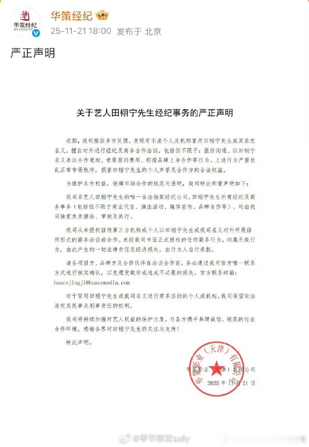 华策发声明了,说有人冒充田栩宁团队谈商务