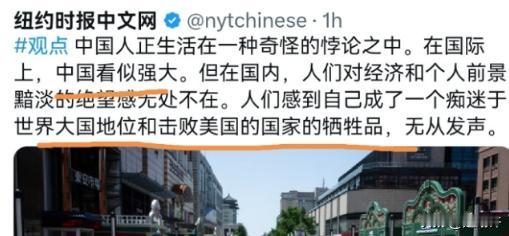 纽约时报称,“中国人生活在一种奇怪的悖论中,在国际上中国看似强大,但在国内,人们对经济和个人前景暗淡的绝望感无处不在,人们感到自己成了一个痴迷于世界大国地位和击败美国的国家牺牲品,无从发声。”老实说,这一段话表面上看似乎还挺有道理,但仔细分析一下就知道,完全是舆论战的拙劣手段。 《纽约时报》说的这个“中国悖论”,听着好像挺有道理,其实就是老调重弹换了身衣裳——先给中国扣个“外强中干”的帽子,再撺掇着说老百姓是“为了国家当大国牺牲的人”,这套舆论战的花招,咱们早看腻了。 说白了,他们就是抛出个假问题,勾着大家争“国家强重要还是个人好重要”,不管吵成啥样,只要咱们心乱了,他们就称心了。 就说经济和咱们日子的事儿,这几年经济发展的实惠,全落在老百姓的工资卡上了。不是虚数,是每月多出的钱能给孩子添玩具、给老人买好药的踏实,这份底气藏在日常里。 农村的变化更显眼:2021到2024年农村居民收入年均实际增长6.9%,比城镇快2.4个百分点,城乡收入比降到2.34。 以前村里亲戚一年攒不下钱,现在搞电商卖土特产,不少人年收入能到两三万。脱贫县居民收入增速更快,年均达7.8%。这样的“经济暗淡”,怕是很多国家都要羡慕。 就别说消费了,2024年人均消费支出28227元,教育文化娱乐这些享受型消费年均涨10%,恩格尔系数降到29.8%,大家兜里的钱不光能吃饱穿暖,还能出去旅游、看演出、报兴趣班,这哪是“绝望感”,分明是日子越过越有奔头。 还有就业,这可是关系到饭碗的大事,要是前景真那么差,哪能有73439万就业人员? 2024年城镇调查失业率才5.1%,比2020年还降了0.5个百分点,一年就帮515万失业人员重新找到工作,163万困难人员也有了岗位。 现在年轻人找工作路子多着呢,不光能进工厂、考公务员,还能搞直播带货、做自媒体、当宠物美容师,连以前觉得“不稳定”的外卖骑手、网约车司机,现在都有了社会保障兜底。 第三产业就业人员占比都快到一半了,这些新岗位新职业,都是国家发展带来的实实在在的机会,要是真像外媒说的那样“前景暗淡”,哪来这么多谋生的门路。 国家强大不是摆着看的空架子,是跟每个人的日子绑在一起的。就说医保吧,2024年末13.3亿人都参保了,覆盖率常年稳定在95%左右,城乡居民医保人均财政补助都涨到670元了,比2020年涨了21.8%。 以前农村老人怕生病,觉得进医院就是无底洞,现在揣着医保卡去乡镇医院,常见病报销比例能到七成以上,个人看病负担一年比一年轻,2023年个人卫生费用占比都降到27.3%了。 还有养老保险,10.7亿人参保,企业退休人员月均养老金都3162元了,农村老人也能领基础养老金,不用再完全靠儿女养活,这安全感不是国家强大给的,难道是天上掉下来的? 至于说“无从发声”,那更是睁眼说瞎话。现在随便打开个政务APP,或者上国务院“互联网+督查”平台,有啥诉求直接留言就行。 平顶山高新区接收了17件群众诉求,全按时办结了;蚌埠禹会区处理类似问题平均才花2天,办结率都是100%。 小区里充电桩不够用、楼下餐馆油烟太大、农村公路坑洼难走,这些鸡毛蒜皮的民生小事,只要反映上去,用不了多久就有人来解决。 要是真没渠道发声,这些老百姓的急难愁盼问题怎么能解决得这么快?外媒大概是没见过咱们的政 务留言板,以为还能靠“无从发声”这种老套路骗流量,未免太落伍了。 还有那些说“国家强跟个人没关系”的论调,5G技术就是最好的反驳。中国5G标准必要专利声明量全球占比超42%,应用融入了97个国民经济大类里的74个,光“5G+工业互联网”项目就超过1.5万个。 这些技术不是用来撑面子的,工厂里的5G智能设备让工人少跑腿、多挣钱,农村的5G基站让土特产通过直播卖遍全国,医院的5G远程手术让偏远地区患者能看上大专家。 连咱们日常用的千元5G手机、出门扫的5G健康码,都是国家科技实力的体现,这些便利哪一样没落到老百姓身上? 《纽约时报》大概是把自己国家的困境套到中国身上了,才编出这种“悖论”。 他们看不到中国老百姓收入一年比一年高,看不到医保社保覆盖面越来越广,看不到反映问题就能得到解决,一门心思玩舆论战的老把戏。 其实大家心里都门儿清,国家强大了,腰杆才能硬,日子才能越过越红火。 那些说“绝望感无处不在”的人,要么是没见过凌晨菜市场的烟火气,没算过工资卡的增长,要么就是揣着明白装糊涂,想靠抹黑中国挣黑心钱。 这种拙劣的舆论战手段,也就只能骗骗那些没来过中国的外国人,咱们自己的日子过得怎么样,难道还需要外媒来指手画脚?