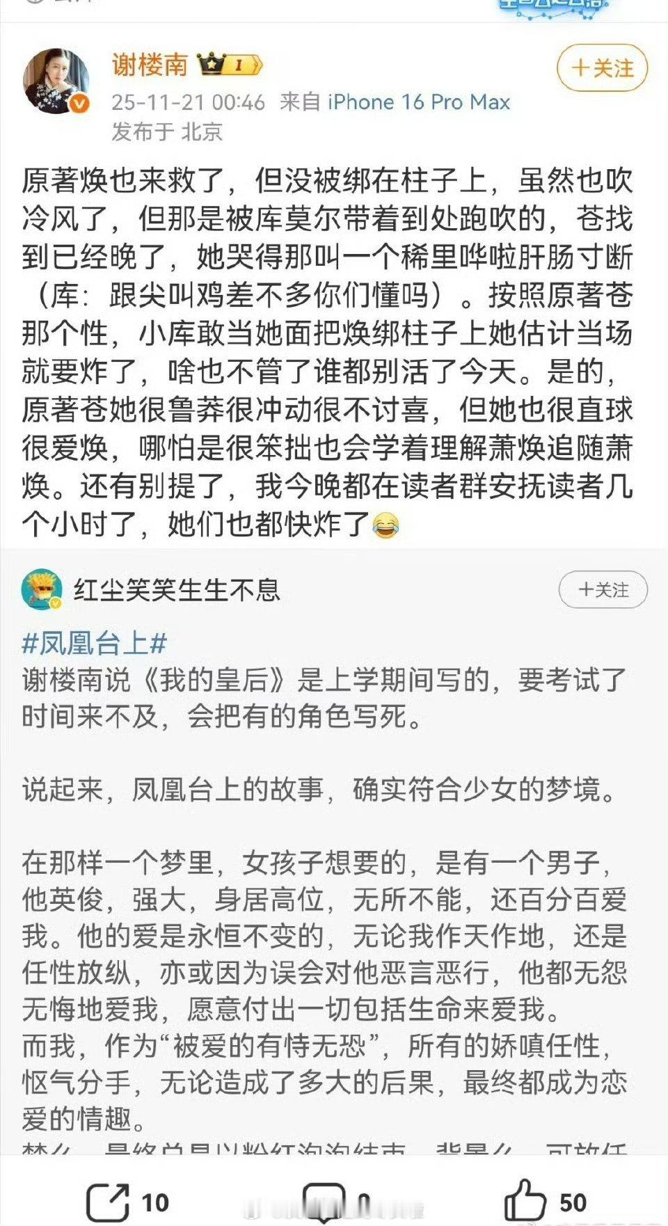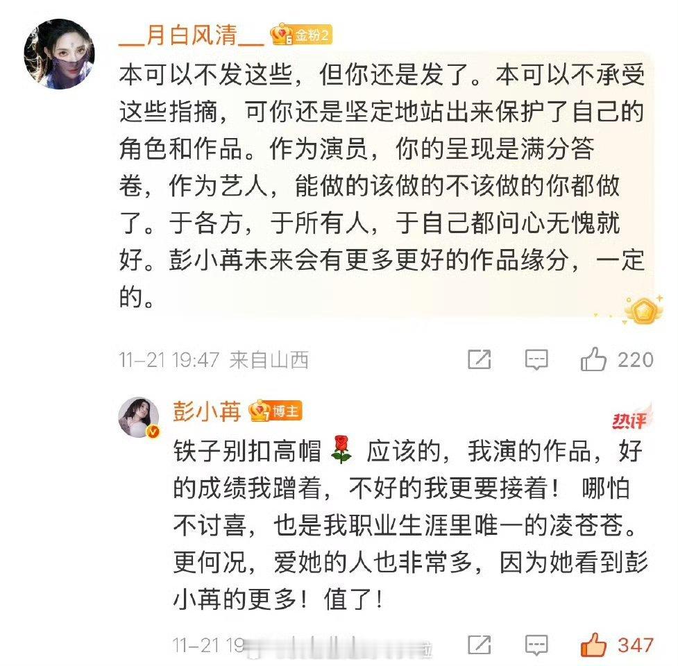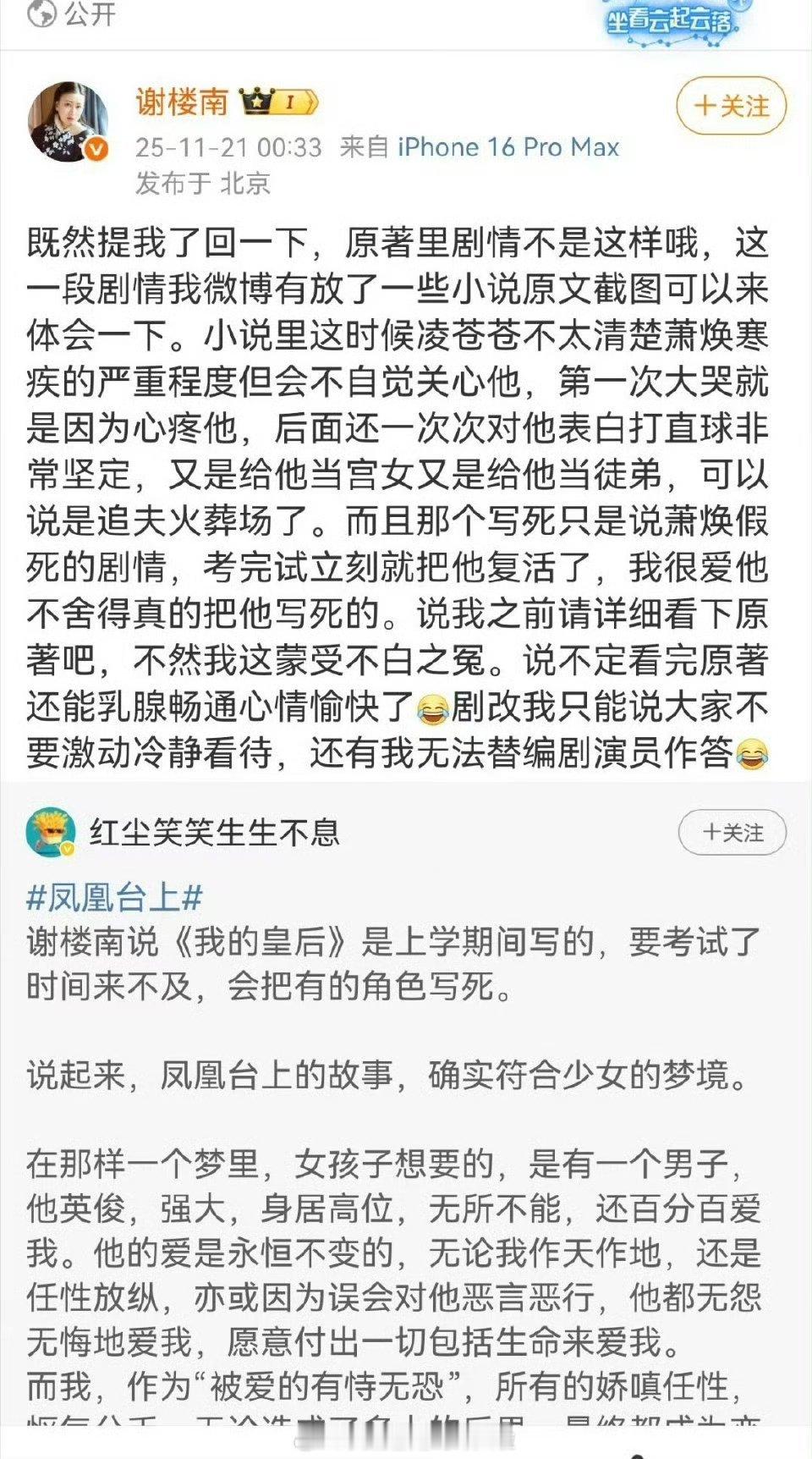 《凤凰台上》原著作者开麦质疑彭小苒没有共情角色,没有演出女主对男主的爱意彭小苒直接发博长文回应了,称女主的人设她决定不了,开拍时只有1集剧本,边拍边改,作为创作者她已经尽最大努力,还承认了《凤凰台上》剧播成绩不好,越是这种时候越应该团结,而不是跳出来切割,互相伤害不过这作者能说出女主给男主端茶倒水是通乳腺情节,三观和这书一样都挺古早的