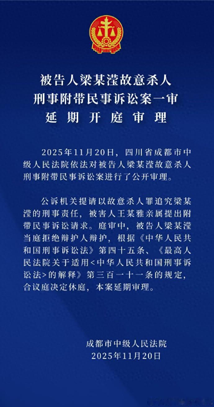 成都中院:被告人梁某滢故意杀人刑事附带民事诉讼案一审延期开庭审理 法律的权威在