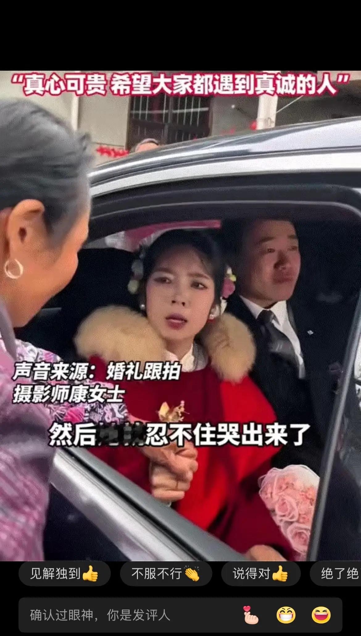 看哭无数人!江西吉安婚礼现场,新娘与奶奶道别泪崩,新郎全程陪哭太好哭 我看感动哭了,江西吉安一婚礼接亲现场,新郎接新娘坐上婚车准备离开之时,新娘奶奶则来到婚车前和新娘道别,但奶奶和新娘还没说上几句话,双方已是泪流满面,而新郎见状也是全程陪哭满是心疼。 老人颤巍巍地扒着婚车车窗,干枯的手指紧紧攥着孙女的手,指腹反复摩挲着她的手背。那双手爬满了深浅不一的皱纹,关节处有些变形,却依旧带着熟悉的温度,像是要把积攒了二十多年的疼爱,都在这最后的时刻传递给她。奶奶张了张嘴,想说的话堵在喉咙里,刚发出几个含糊的音节,眼泪就先掉了下来,砸在新娘的手背上,烫得人心里发紧。新娘再也忍不住,把头偏向车窗,肩膀剧烈地抽动着,泪水像断了线的珠子,顺着脸颊往下淌,打湿了洁白的头纱。 周围的亲友都红了眼眶,有人悄悄抹着眼泪,没人上前催促。谁都懂这种离别里藏着的深情。新娘是奶奶一手带大的,小时候总黏在奶奶身后,跟着她去菜园摘菜,坐在灶台边等一碗热乎的红薯粥,冬天冻得缩手缩脚时,奶奶会把她的小手揣进自己怀里暖着。那些平淡日子里的细碎陪伴,早已刻进了彼此的生命里。长大后新娘外出求学、工作,回家的次数越来越少,奶奶总是在村口盼着,每次都把最好吃的东西留着,等她回来才舍得拿出来。 现在孙女要嫁人了,要去组建自己的小家庭,要从这个从小长大的家彻底“离开”。奶奶的眼泪里,有不舍,有牵挂,更有放心不下。她怕孙女在新的家庭里受委屈,怕她没人像自己这样无条件地包容她、疼她,怕她遇到难处时没人第一时间站出来护着她。那些没说出口的话,都是“到了那边要好好照顾自己”“多给家里打电话”“受了委屈就回来”的牵挂。 新郎站在一旁,没有半句催促,只是默默地递上纸巾,自己的眼眶也红得厉害,眼泪顺着脸颊往下流,却依旧温柔地看着新娘和奶奶。他没有觉得这种场面“矫情”,反而深深懂得这份亲情的重量。他知道,眼前这位老人,把自己捧在手心里疼了二十多年的宝贝,今天郑重地交给了自己,这份信任和托付,比任何誓言都沉重。一个愿意陪着妻子为亲情落泪的男人,心里一定装着温柔和责任,这样的婚姻,从一开始就透着让人安心的模样。 很多网友看了这段视频,都忍不住想起自己出嫁时的场景。有人说“我出嫁那天,奶奶也是这样哭,我坐在婚车里不敢回头,怕一回头就舍不得走”,有人说“隔代亲真的太好哭了,奶奶的爱从来都是最纯粹、最不求回报的”,还有人说“新郎的反应太圈粉了,懂得心疼妻子、尊重长辈的男人,值得托付”。 其实婚礼的意义,从来不止是仪式的盛大,更是亲情与爱情的传承。新娘的眼泪,是对过往岁月的不舍,是对奶奶养育之恩的感念;奶奶的眼泪,是对孙女未来的期盼,是藏在心底的牵挂;新郎的眼泪,是对妻子的疼惜,是对这份亲情的敬畏。婚姻从来不是两个人的孤立结合,而是两个家庭的温暖相融,是把对方生命里最重要的人,当成自己的亲人去珍惜。 那些藏在眼泪里的爱,那些没说出口的牵挂,都是我们人生路上最宝贵的财富。无论走多远,无论过得好不好,家里总有一盏灯为我们亮着,总有一群人在牵挂着我们。这份爱,是我们勇往直前的底气,也是我们永远的心灵归宿。 各位读者你们怎么看?欢迎在评论区讨论。