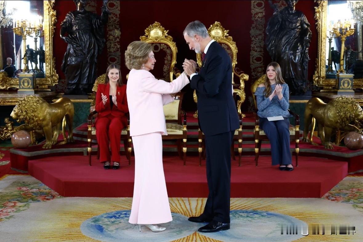 11月21日,西班牙马德里皇宫的金羊毛授勋仪式超有看点!现年87岁的索菲亚王后获此殊荣,成了第五位拥有金羊毛勋章的女性。 前面四位分别是荷兰前女王碧翠丝、英女王伊丽莎白二世、丹麦女王玛格丽特二世和西班牙公主莱昂诺尔。 金羊毛勋章可是欧洲最古老的勋章之一,灵感源于古希腊“伊阿宋寻找金羊毛”的故事,象征着勇敢和冒险。 授勋现场,西班牙王室三代同框,索菲亚王后和莱蒂齐亚王后亲密同框,画面温馨。 想当年婆媳俩关系紧张,如今能如此融洽,也是岁月磨合的结果。
