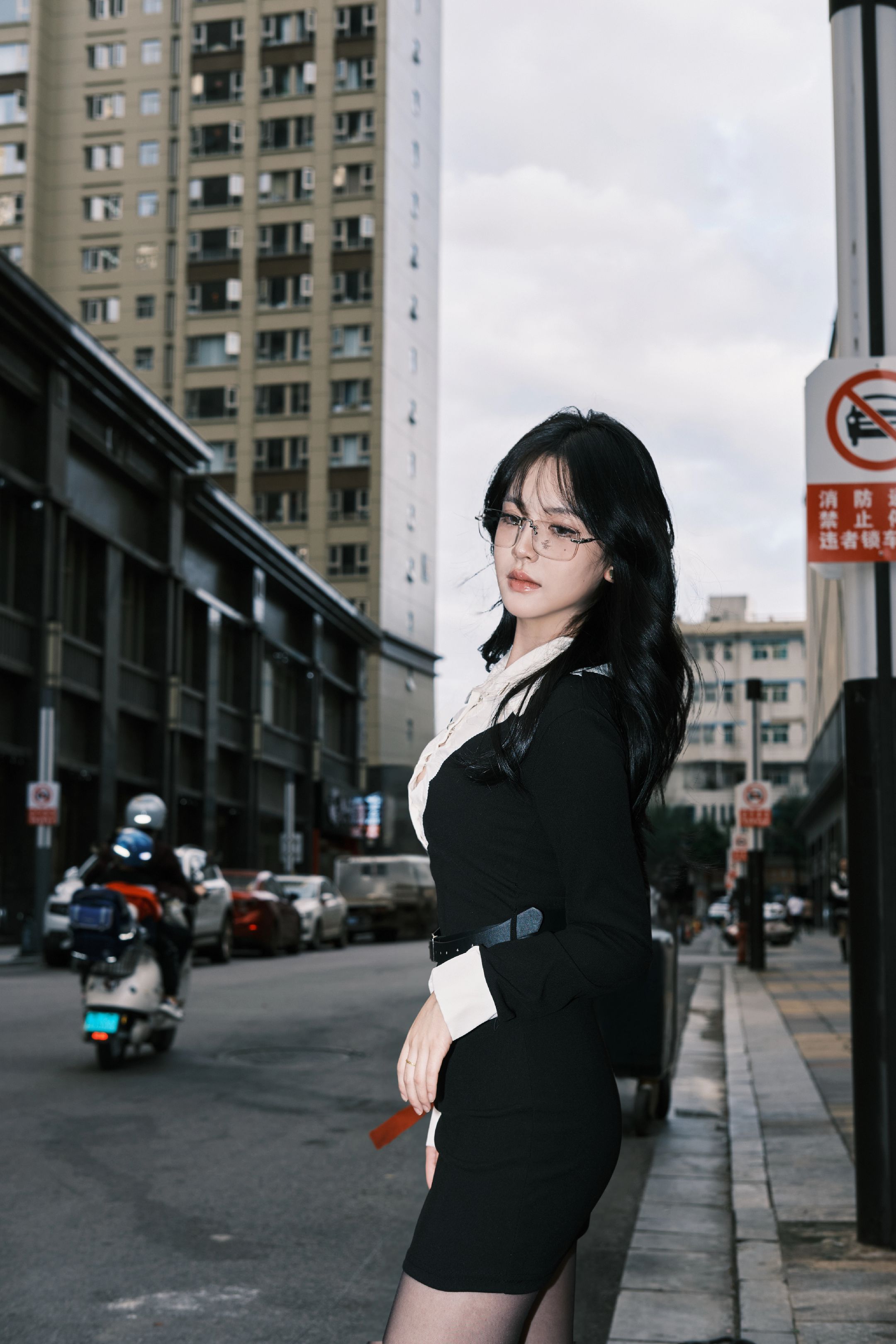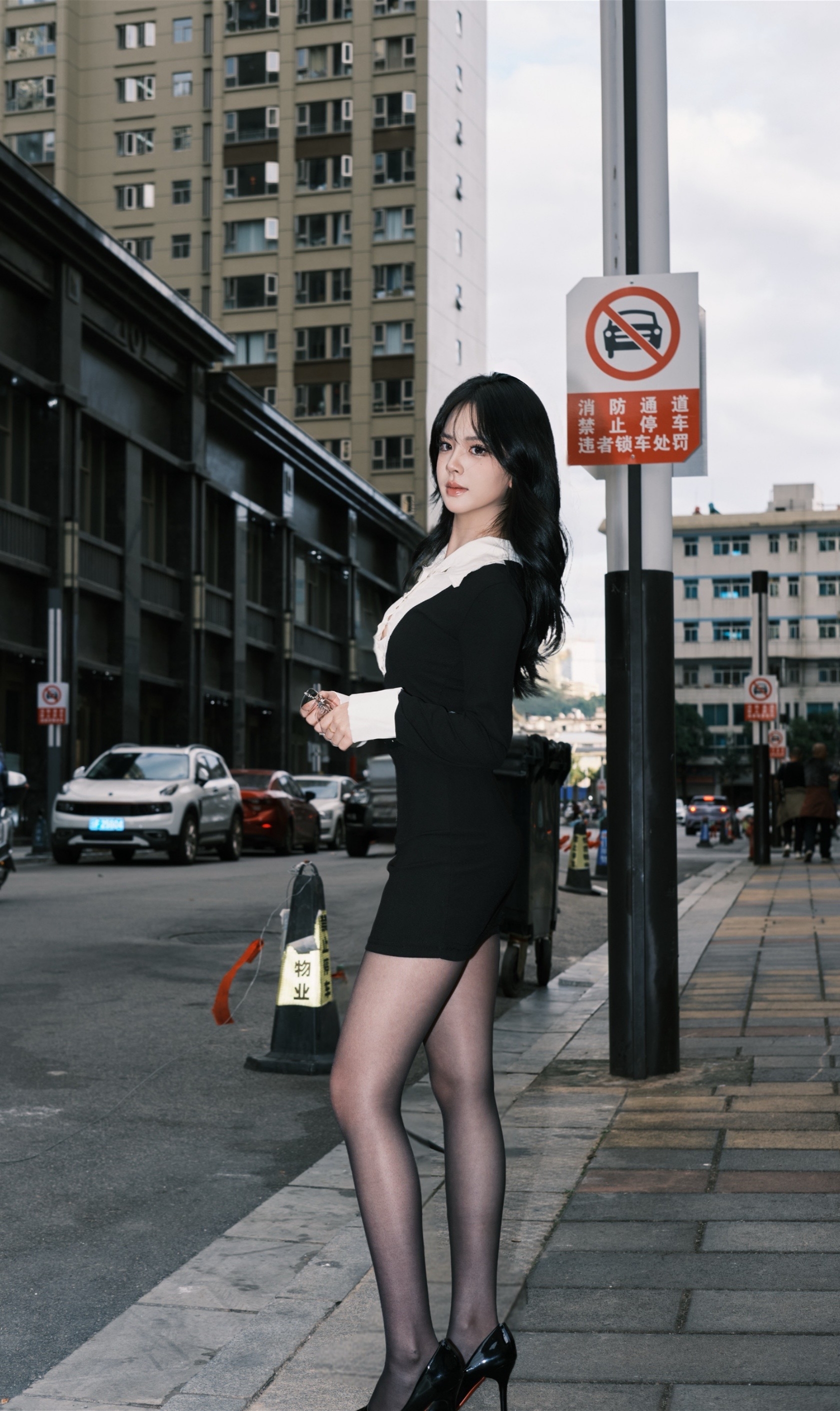 白衬衫+黑短裙简约利落,长发配精致发夹温柔又干练,脚踩透明高跟更显气质。