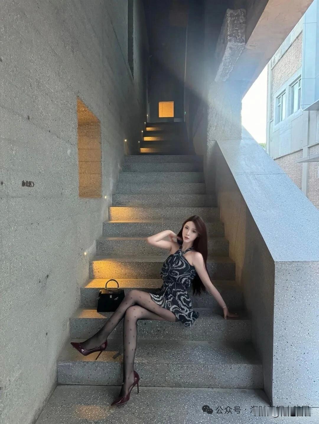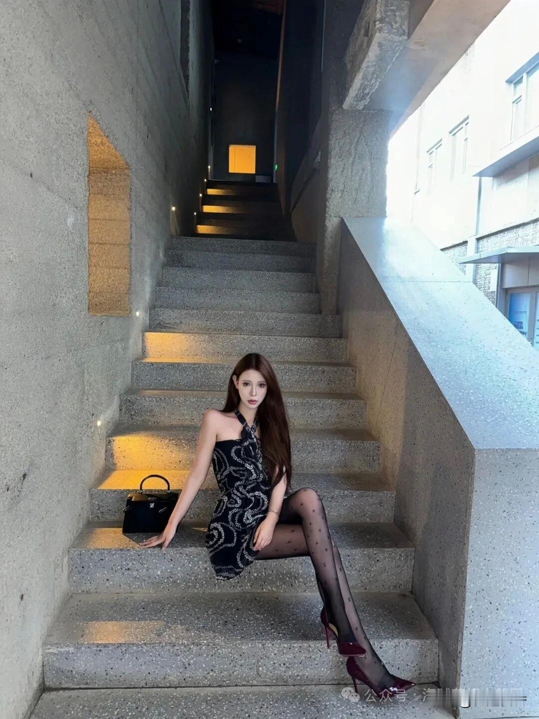 都市时尚风,黑裙红唇,优雅坐楼梯,尽显魅力!