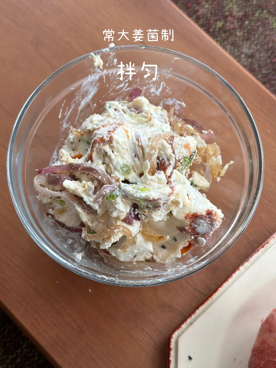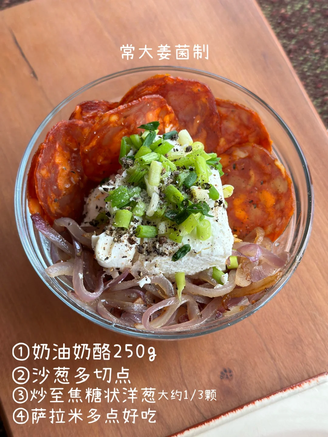 再煎点口蘑🍄、抹上昨天做的🧀洋葱萨拉米涂抹奶酪🧀