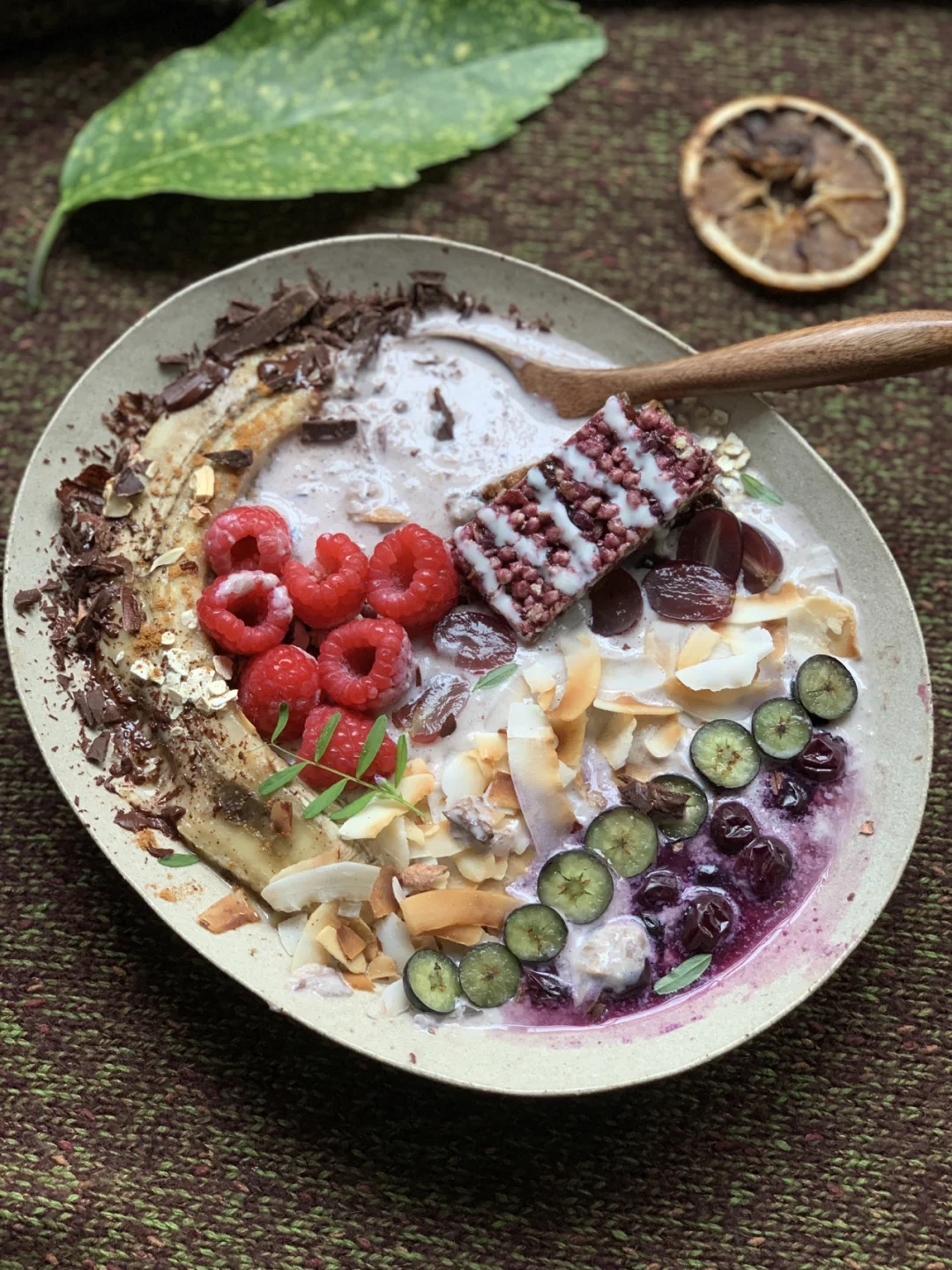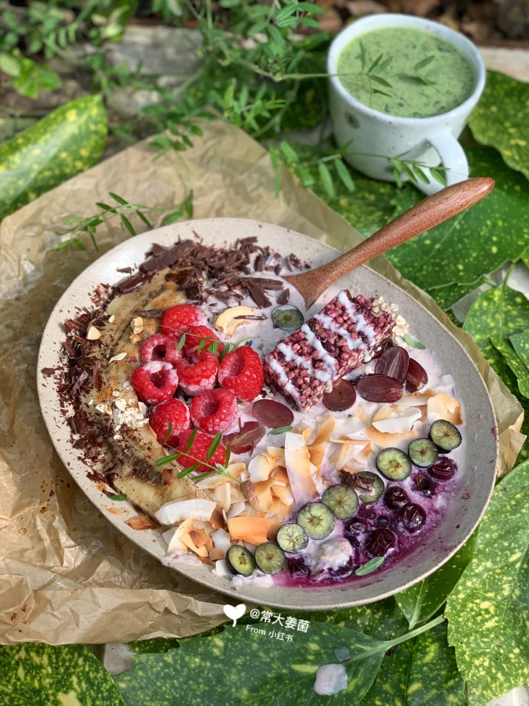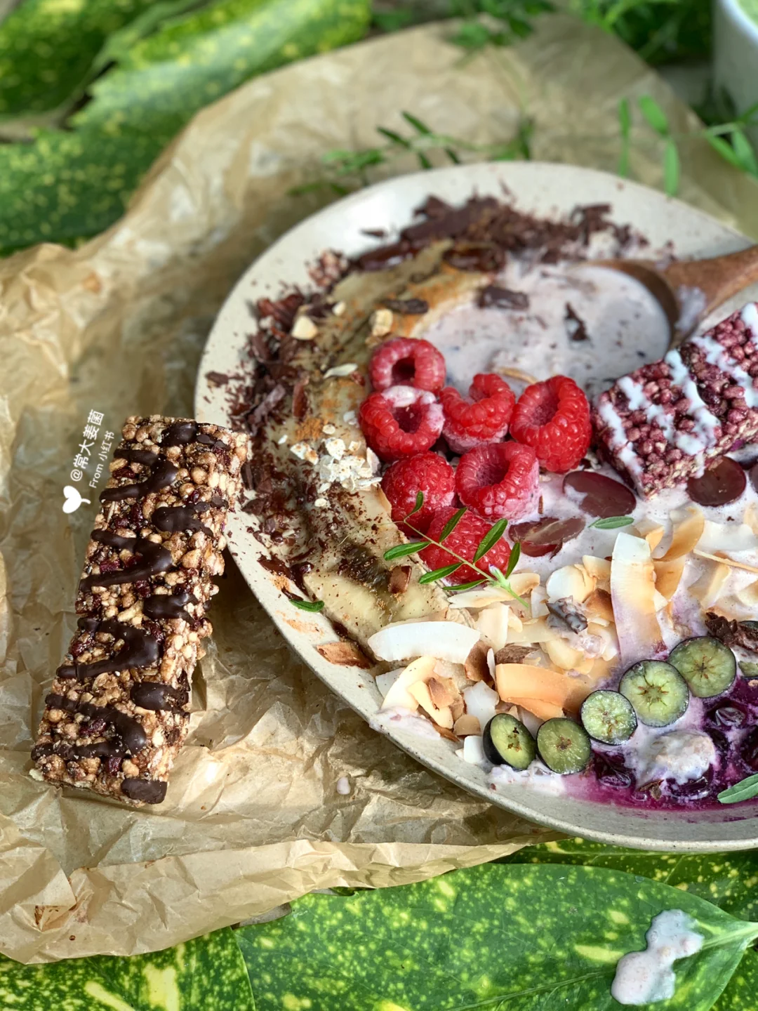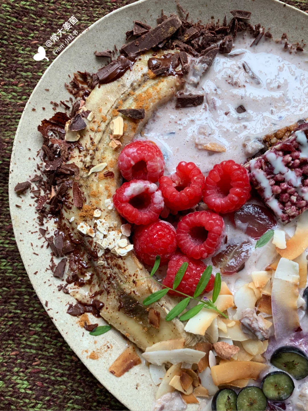 酸奶混合物打成糊糊,摆上自己喜欢的水果➕坚果~