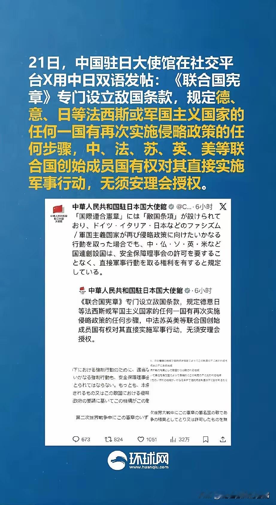 这应该是最后的通牒了。 中国驻日使馆重申敌国条款,这已经不是警告,是最后的通牒。 意思就是你再敢往前走一步,我就随时可以动手了。同时也是警告小日本的干爹,我的忍耐是有限度,不信你们可以试试,第一枪可以是我开和我不会开第一枪并不予盾。 麻烦看官老爷们右上角点击一下“关注”,既方便您进行讨论和分享,又能给您带来不一样的参与感,感谢您的支持!