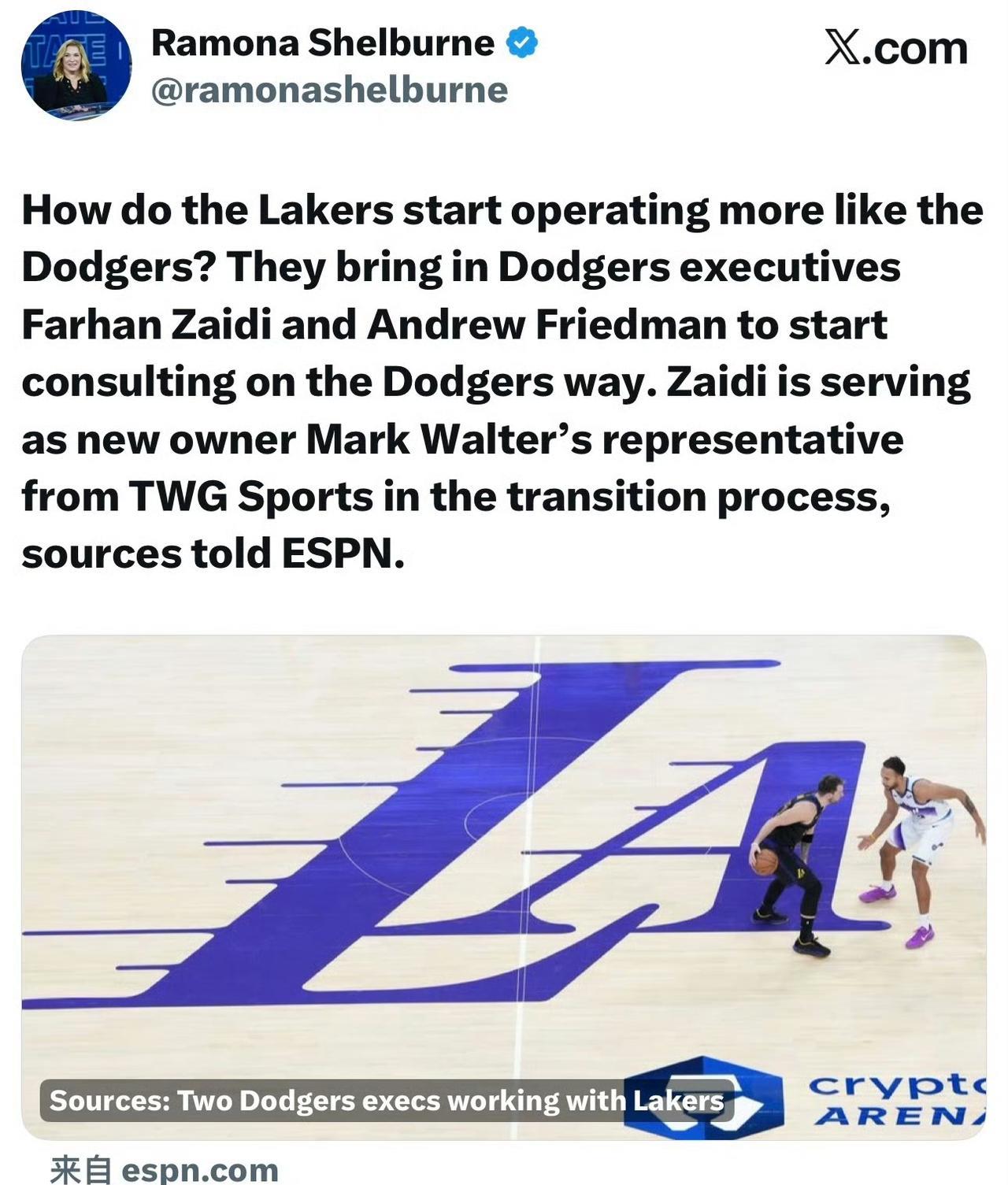据ESPN名记Ramona Shelburne报道,洛杉矶道奇的两名高管法尔汉·扎伊迪和安德鲁·弗里德曼将进入湖人管理层担任顾问。 据报道,这是湖人从巴斯家族向新老板马克·沃尔特过渡的一部分,沃尔特同时拥有道奇和湖人两支球队,两队将成为沃尔特创建TWG体育的一部分,扎伊迪和弗里德曼都是TWG体育的高管。 据了解,扎伊迪还负责一部分WNBA球队洛杉矶火花队的工作,火花队也由沃尔特和TWG体育所拥有。 消息人士透露,道奇特别顾问扎伊迪以数据分析背景而在圈内为人熟知,他正在担任沃尔特的代表,协助进行过渡工作。而道奇运营总裁弗里德曼的角色较小,主要与佩林卡进行合作。