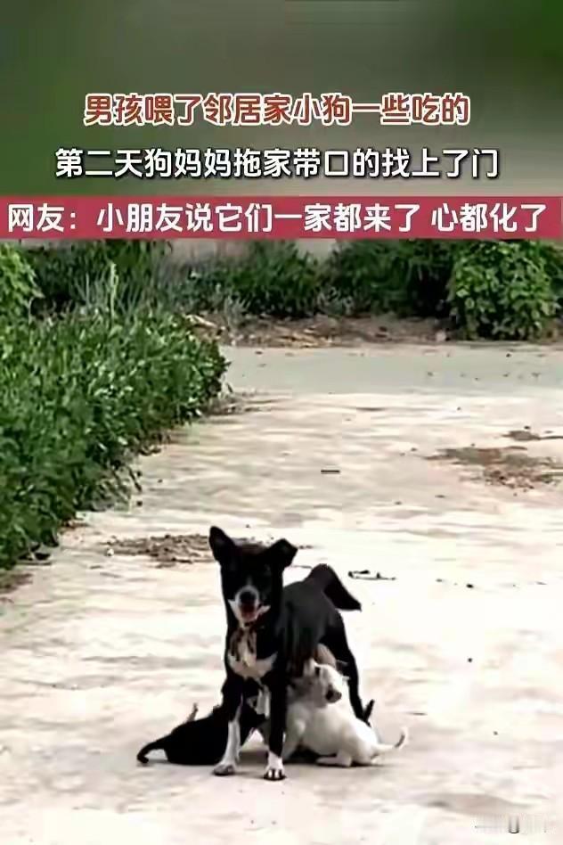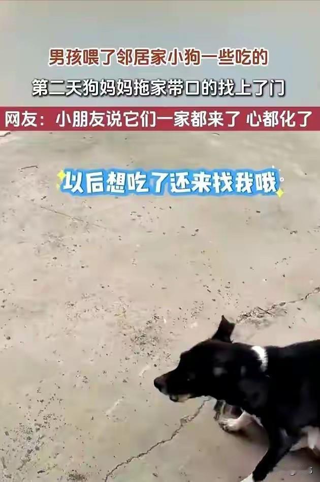 这天,一位小男孩看到邻居家的狗狗跑到自己家的院子里来,于是他就拿了一些食物投喂它,狗狗津津有味地吃了起来,小男孩很想拥有一只自己的狗狗,可爸妈不给她买,所以他和狗狗玩的很开心。后来狗狗吃饱了就回去了。 结果第二天这只狗狗居然拖家带口找上门来了,它的三只狗宝宝也跟着妈妈来了,小男孩更加开心了,感觉心都化了。后来邻居得知了这事就送了一只小奶狗给他,这样一来狗妈妈去他家的频率就更高了。