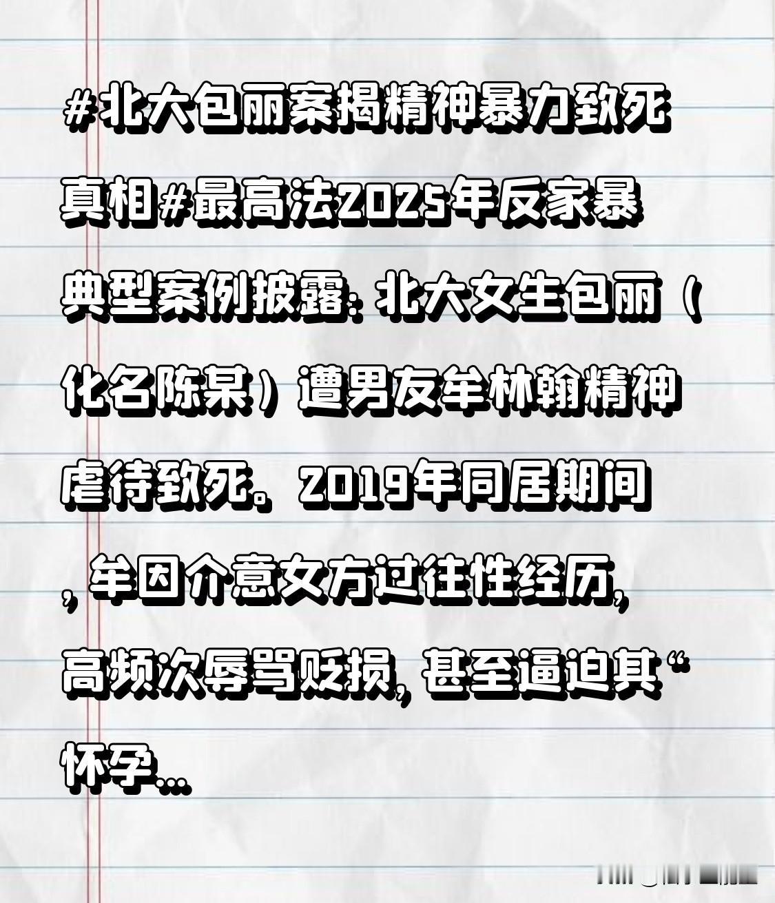 最高法2025年反家暴典型案例披露:北大女生包丽(化名陈某)遭男友牟林翰精神虐待致死。2019年同居期间,牟因介意女方过往性经历,高频次辱骂贬损,甚至逼迫其“怀孕堕胎换心理平衡”。包丽两次自残送医后,仍被持续施压,终在10月9日服药自杀。 法院认定牟林翰虐待行为与死亡存在直接因果关系,以虐待罪判处其有期徒刑三年二个月。此案首次将精神操控(PUA)致人死亡纳入反家暴惩治范畴,标志司法对无形暴力的零容忍。 数据来源: 最高法2025反家暴典型案例 案件时间线还原 (亲密关系中的精神绞杀,同样致命!)