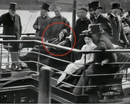 1896年,李鸿章访问英国的照片他戴兜帽,腿上盖着毯子,左脸被日本人开枪擦伤的弹