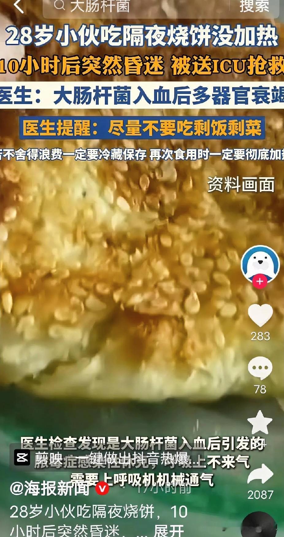 "悲剧还是发生了!"近日,河南郑州,一男子吃完饭后,觉得这两天气温低,烧饼不放冰箱也没事,第二天吃的时候也没加热,结果吃完几个小时后,男子突然晕倒在地,被送往医院治疗,诊断为脓毒症感染性休克!网友:一点常识都没有? 冬天室温低只是表面现象,室内温度再低也有十几度,这个温度正好成了细菌繁殖的温床。烧饼这种淀粉类制品最容易滋生大肠杆菌,短短一夜时间就能让细菌数量翻上几十倍。 这个小伙子犯了两大致命错误:烧饼常温存放过夜、吃之前不加热。大肠杆菌在100℃煮沸15-30分钟就能被杀灭,可他连最简单的加热步骤都省了。结果细菌进入血液引发脓毒症,直接送进ICU插管抢救,呼吸都成问题。 类似案例比比皆是,每年都有不少人栽在"隔夜食物"上。特别是淀粉类制品和泡发食品,像木耳、银耳这些,放久了会产生米酵菌酸毒素,吃下去直接导致多器官衰竭。有些人总抱着侥幸心理,觉得"看着没坏就能吃",殊不知细菌早就超标了。 厨房里藏着不少健康杀手,大肠杆菌、李斯特菌、沙门氏菌,个个都不是省油的灯。李斯特菌更厉害,冰箱低温都挡不住它繁殖,所以光放冰箱还不够,必须彻底加热。这些细菌感染症状差不多,都是发烧腹泻,普通人根本分不清,耽误治疗可就危险了。 正确处理剩饭其实很简单:两小时内放进冰箱,吃之前彻底加热到75℃以上。最好做到"剩荤不剩素",绿叶蔬菜隔夜后亚硝酸盐含量会升高。凉菜和海鲜这类食物尽量当天吃完,别留着过夜。 这起悲剧给所有人敲响警钟,食品安全马虎不得。现代社会医疗技术先进,但预防永远比治疗重要。特别是免疫力较弱的老人孩子,更要注意饮食安全。勤俭节约是美德,可为了省一口剩饭赔上健康甚至生命,这笔账怎么算都亏大了。 各位读者你们怎么看?欢迎在评论区讨论。