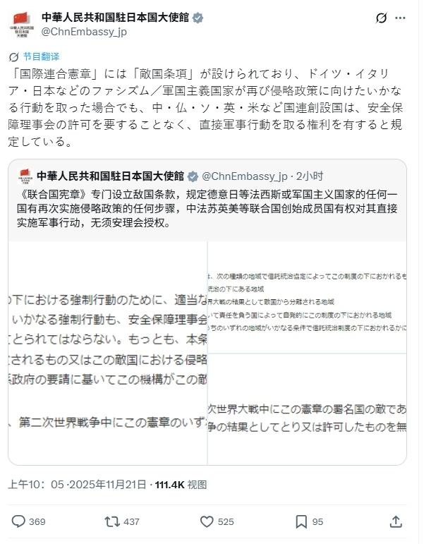 这不就来了吗! 先是,驻日本大使馆,在社媒发布联合国宪章敌国条款。也就是说,针对战败国,可以直接发动攻击,而不需要宣战。 接着,驻联合国代表傅聪,致函联合国秘书长,而且,这份函件,将作为联合国的正式文件,分发给全体会员国。 这代表着什么,大家心里都很清楚。 用大白话说就是,招呼我已经打过了,接下来发生什么,都不要感到惊讶。 有时候,时机就在一瞬间,错过了就不知道下一次要等到什么时候了。