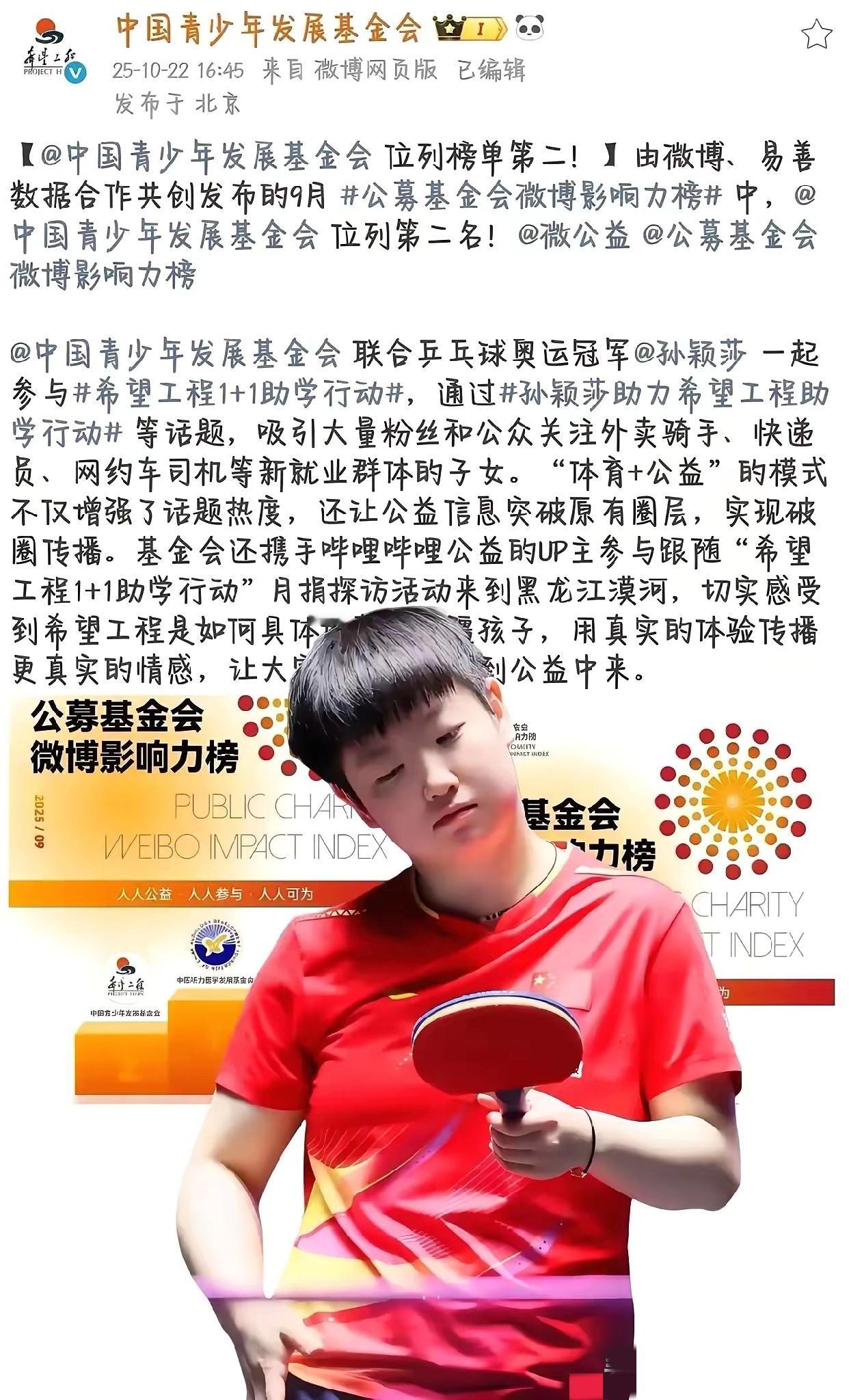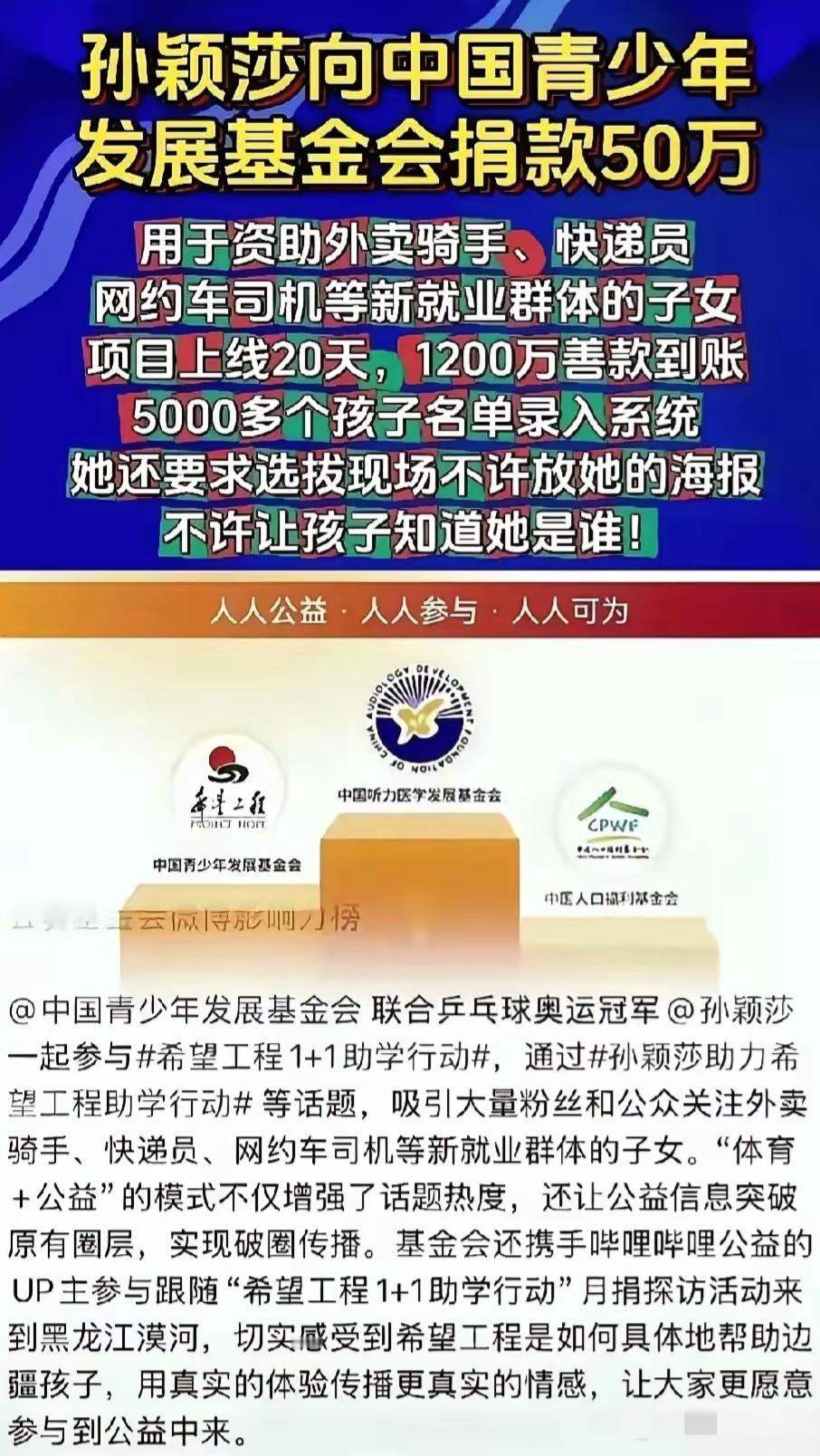 孙颖莎这波真的让人破防! 备战全运会的关键期跑去漠河做公益,捐250万 帮孩子上学,低调到没开一场发布会,结果拿了两块银牌就被黑龙江IP的人骂? 她不是作秀,是真的把公益当“第二赛场”——带着球拍和图书蹲在教室陪孩子上课,留下“敢拼就有机会赢”的鼓励,受助的20名失学儿童和新就业群体子女都是实打实的受益者。 更难得的是,这不是她第一次默默行善,京津冀洪灾、西藏地震都有她捐款捐物的身影。运动员胜败乃兵家常事,孙颖莎拼到决赛拿银牌已然尽力,可某些人却拿名次当武器恶意诋毁。 真正的偶像从不是只有金牌加身,而是像孙颖莎这样,赢了赛场也暖了人心。你觉得该怎么对待运动员的失利和善意?来评论区聊聊~