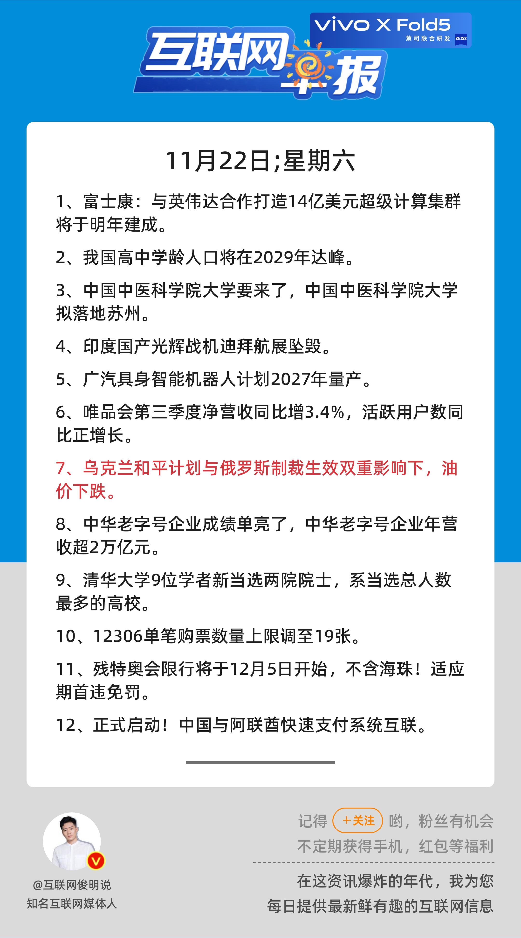 11月22日,星期六,《第2965期》;关心第7条:乌克兰和平计划与俄罗斯制裁生效双重影响下,油价下跌;早安————————————点击右上方关注每天一分钟众览天下事,互联网早报值得拥有! 更多精彩,欢迎加入粉丝群