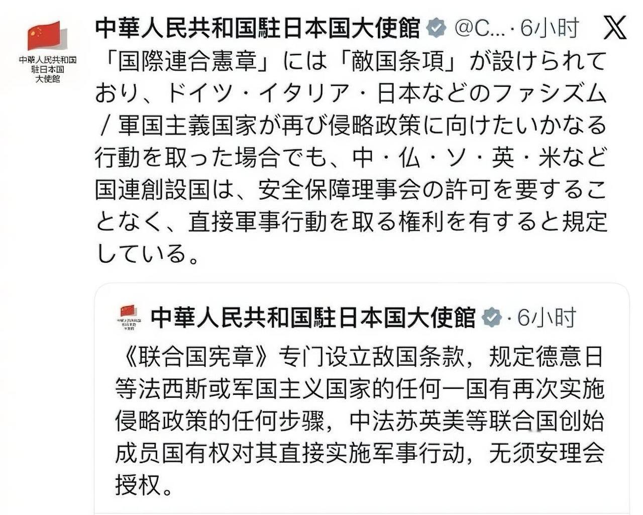 11月21号,中国驻日大使馆在社交平台用中日双语发帖称:《联合国宪章》专门设立的敌国条款,规定德意日等法西斯或军国主义国家的任何一国有再次实施侵略政策的任何步骤,中法苏英美等联合国创始成员国有权对其直接实施军事行动,无须安理会授权。 我们先要搞清楚,这个“敌国”指的是谁。根据《联合国宪章》,“敌国”的定义是:在第二次世界大战中,曾与《联合国宪章》任何签署国(即同盟国)交战的国家。这主要指: 纳粹德国及其盟国 日本帝国 意大利王国,以及其后的意大利社会共和国 其他轴心国成员。 再来了解一下“敌国条款” ,这个条款指的是《联合国宪章》第53条、第77条和第107条中的相关规定。这些条款的核心内容是:允许在第二次世界大战中与轴心国,即德国、日本、意大利等法西斯国家作战的同盟国,即中、法、苏、英、美等“联合国”的创始会员国,可以不经联合国安理会授权,对“任何前述之敌国”因其再度推行侵略政策而采取单方面或集体性的军事行动。 简单来说,该条款将德国、日本等二战战败国在法律上永久性地标记为“潜在侵略者”,并赋予了战胜国在特定情况下“绕开安理会”对其进行军事打击的特殊权力。 也就是说,我们是直接就能动手打,不用考虑第一枪,第二枪的问题,觉得你有再次搞侵略的苗头,就能直接开打。无需理由,无需证据。这张牌打出来,它适用的空间那就实在是太大了! 我们提“敌国条款”这话不光是说给日本听的,也是说给美国人听的,就是说我动手的时候你不许插手,这话说出来美国人再想介入在法理上就没有依据了。不然美国就是自绝于自己在二战之后建立的秩序。 当然了,我们不一定就要一下子上升到热战这个选择,我们的手段还有很多,别的不说,光一个稀土出口管制,就能让日本相当难受! 现在我们亮出最后的底牌,就是要明明白白告诉高市早苗,必须要给出交代,否则我们绝不会轻易罢休!如果不给个交代,我们甚至不介意走到最后一步!