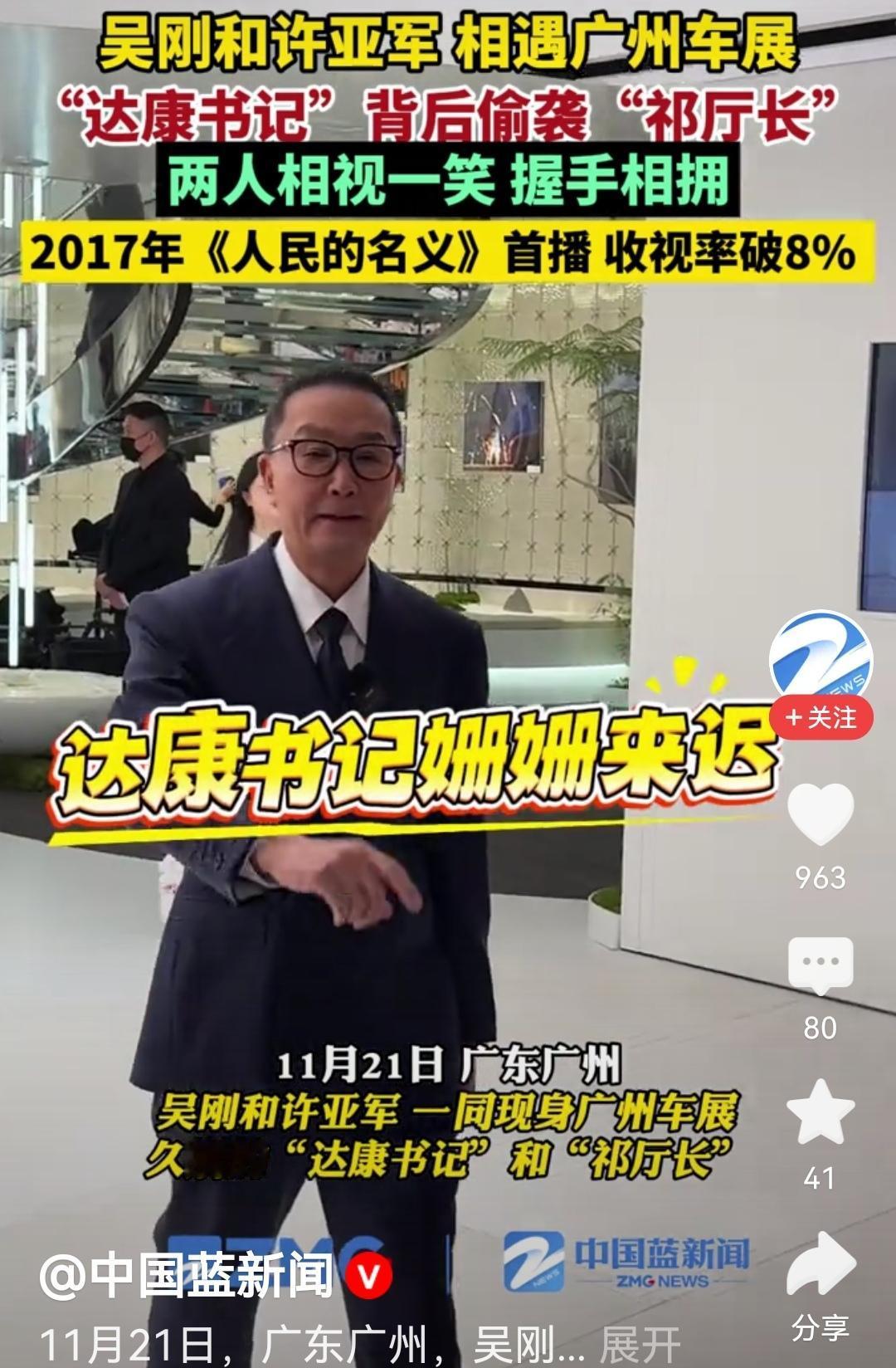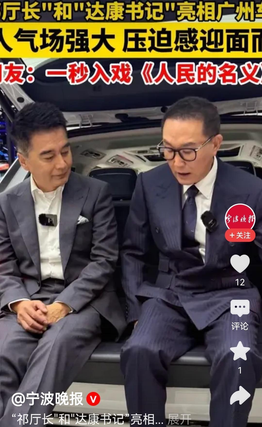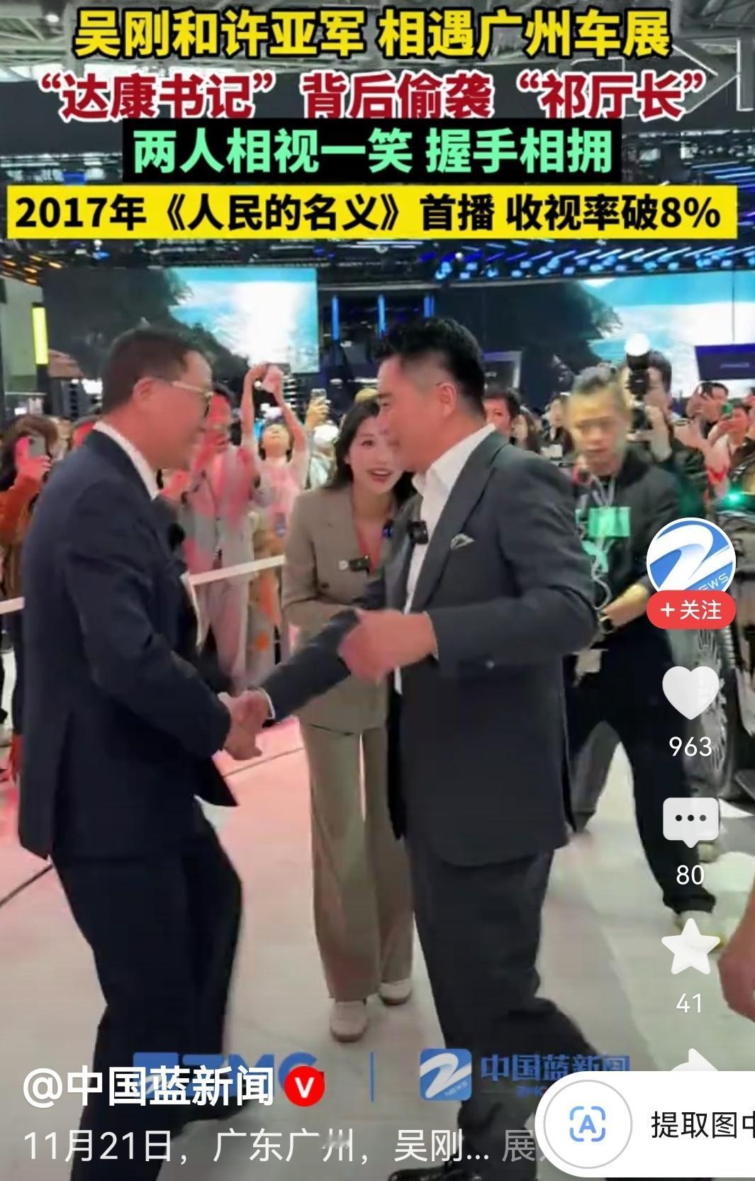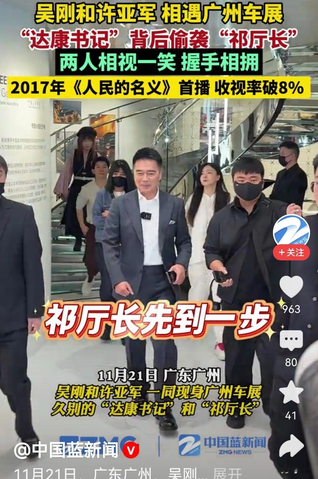 吴刚许亚军广州车展同框,"达康祁厅"联动掀情怀热潮 2025广州车展媒体日现场,一阵欢呼打破了新车发布的专注氛围——吴刚与许亚军的惊喜同框,让观众瞬间穿越回《人民的名义》名场面。这对荧幕"老对手"褪去剧中针锋相对,以默契搭档姿态亮相,坐进后备箱热聊、许亚军为吴刚开车门的画面,迅速刷爆社交平台。 身着干练装束的吴刚,坐进驾驶位时的专注神态,让人想起一心搞事业的"达康书记";许亚军简约穿搭下气场依旧,鬓角少许白丝更添韵味。二人俯身探讨新能源车型细节,时而重现剧中经典对话节奏,引得围观粉丝直呼"DNA动了"。 本届车展以"新科技・新生活"为主题,93台首发车中新能源占比超58%。老戏骨的跨界亮相,让冰冷的汽车科技与影视情怀完美碰撞。这场"爷青回"联动不仅为车展注入人文温度,更印证了实力派演员的持久魅力,成为本届展会最难忘的意外之喜。