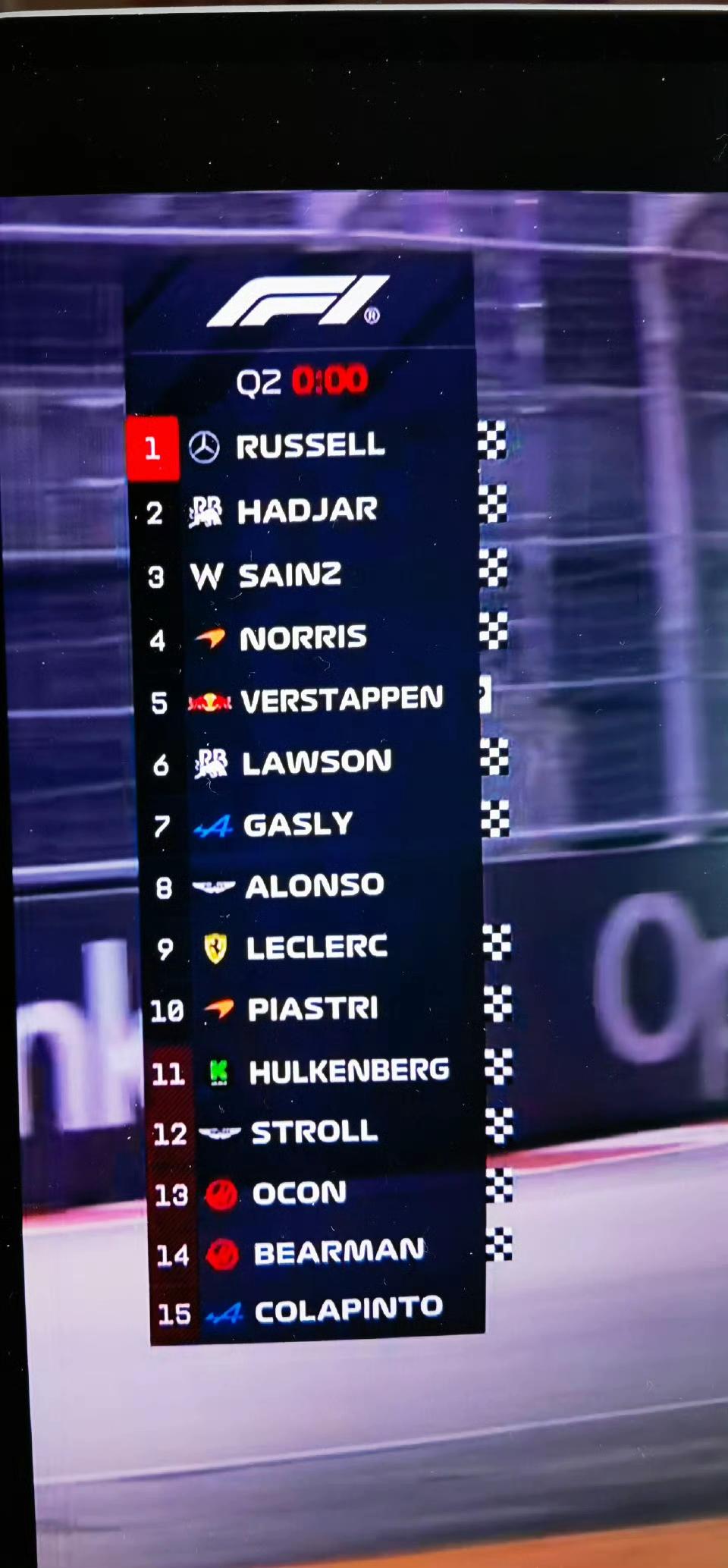 拉斯维加斯排位赛Q2是一场活久见的全雨胎的较量,蓝色全雨胎少见地被全场车手使用。 依然是拉塞尔P1(1:50.935),霍肯伯格、斯托尔、奥康、贝尔曼和科拉平托被淘汰。 乐扣、皮亚斯特里惊险晋级Q3,诺里斯P4。