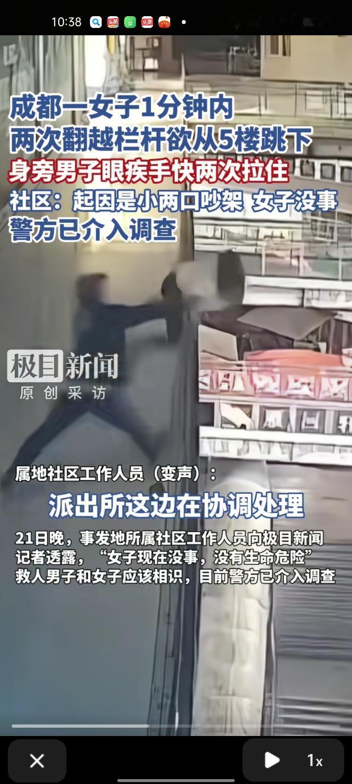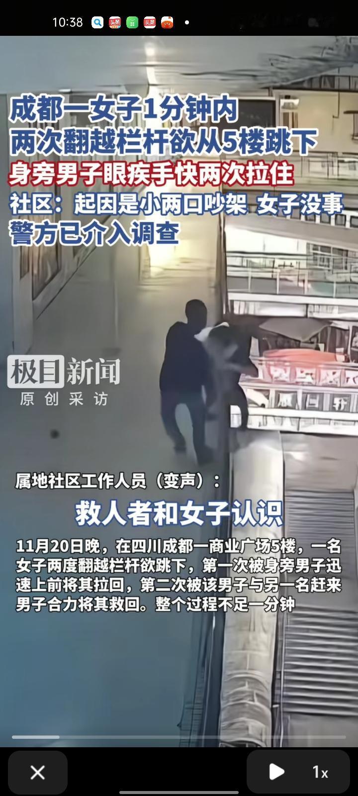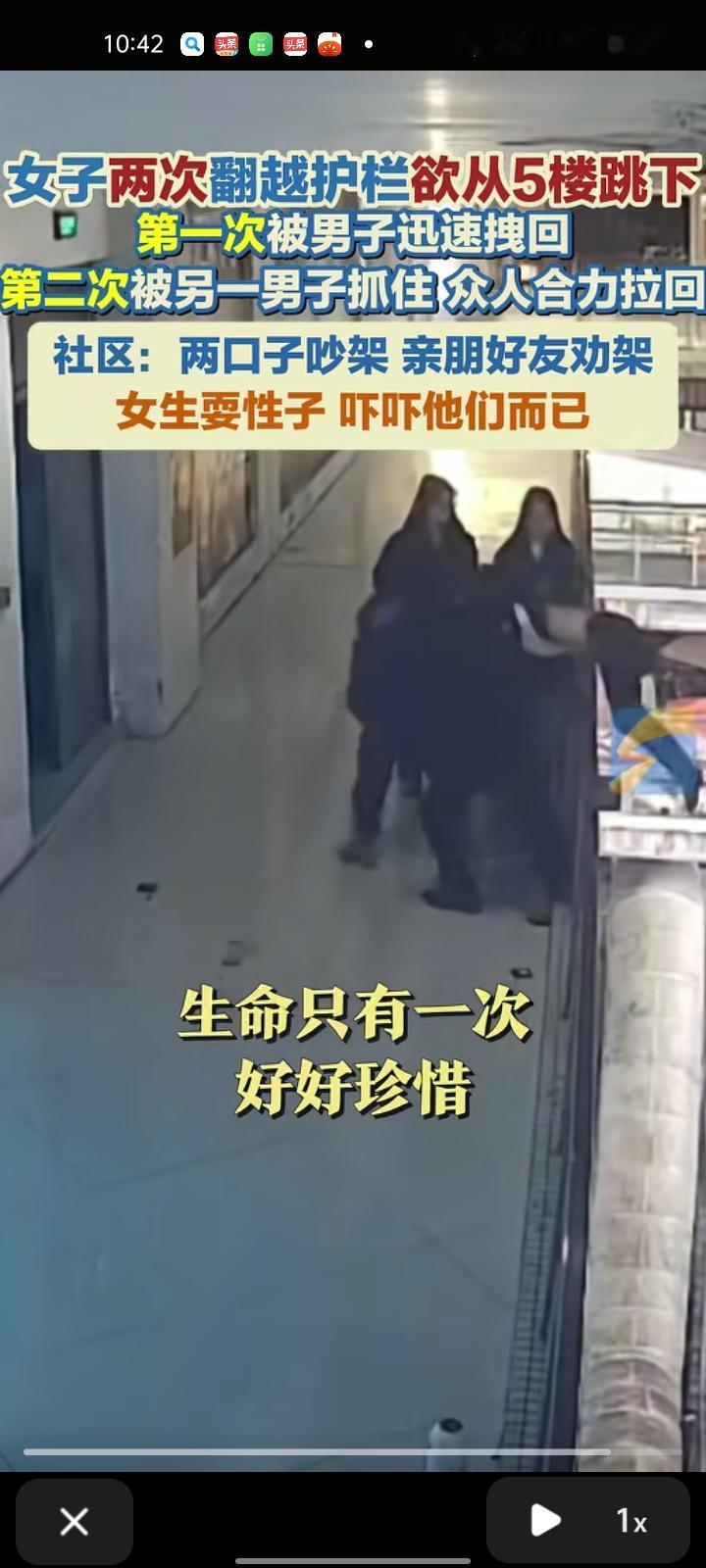 11月20日,四川成都。监控画面显示,一女子两度翻越栏杆欲跳楼,第一次被男子救下,第二次他和另一位赶来的男子以及两位女子救回,整个过程持续30秒。 社区工作人员表示,原因系小两口吵架,亲朋好友拉住了,女子耍性子吓吓他们而已。 不管是什么原因导致吵架,都不可以用自杀来解决问题,因为生命只有一次。要是真跳楼自杀,不仅给自己带来痛苦,还给家庭带来多大的伤害。 当身边的人情绪出现极端波动时,我们要给予更多的关心和理解,及时进行疏导和干预。