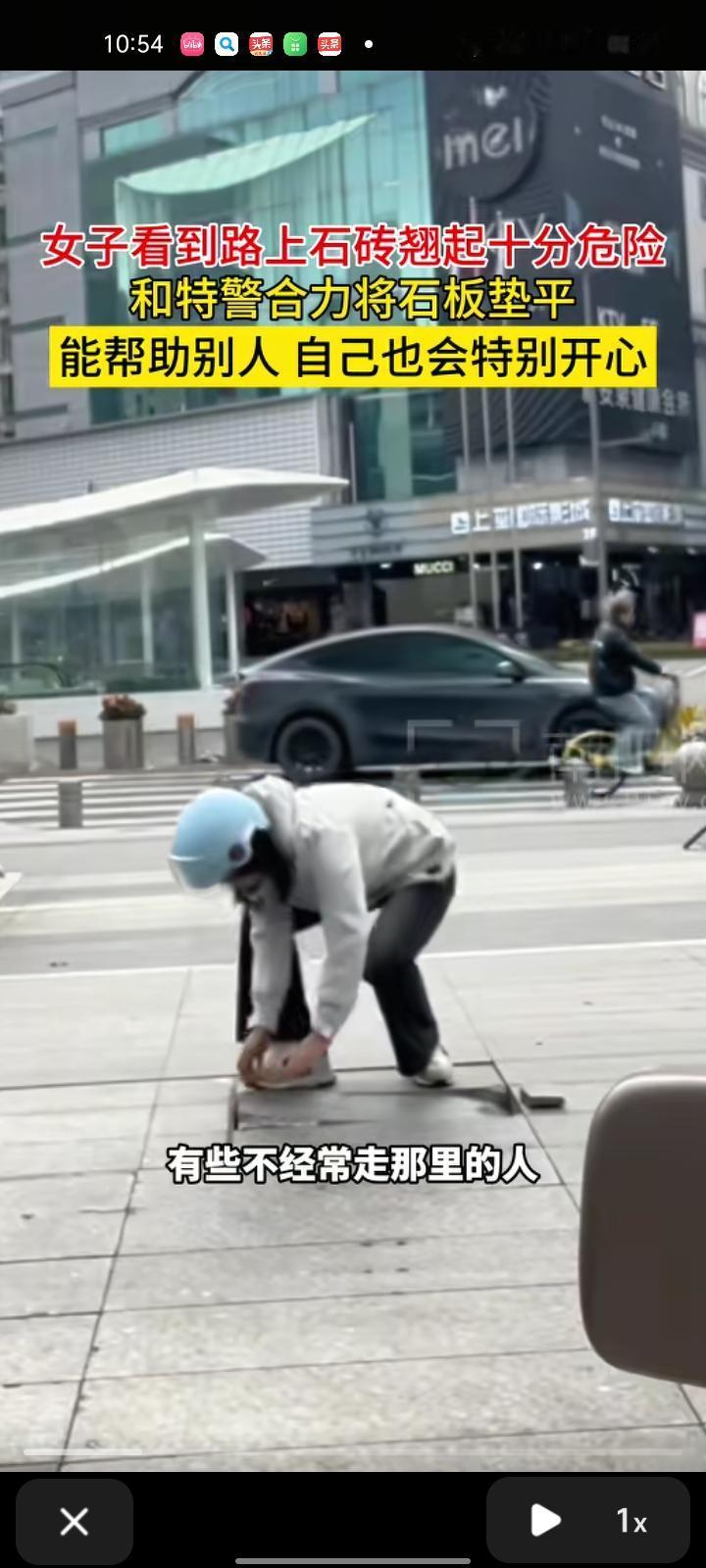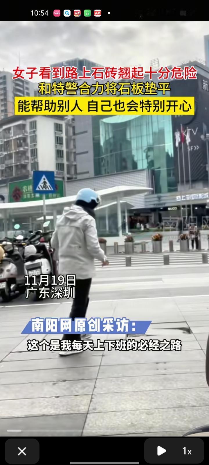 11月19日,广东深圳。女子上班途中发现大块石板松动,万一老人小孩踩到石板被绊倒,后果无法想象。正好人不多就试试搬石板,发现根本搬不动。 正当一筹莫展时,她看见特警在那边执勤,主动喊他来帮忙,特警二话不说就赶来了。先把石板抬起来,把薄石片放下面然后盖住,确认结实后就安心,她自己也感到开心。