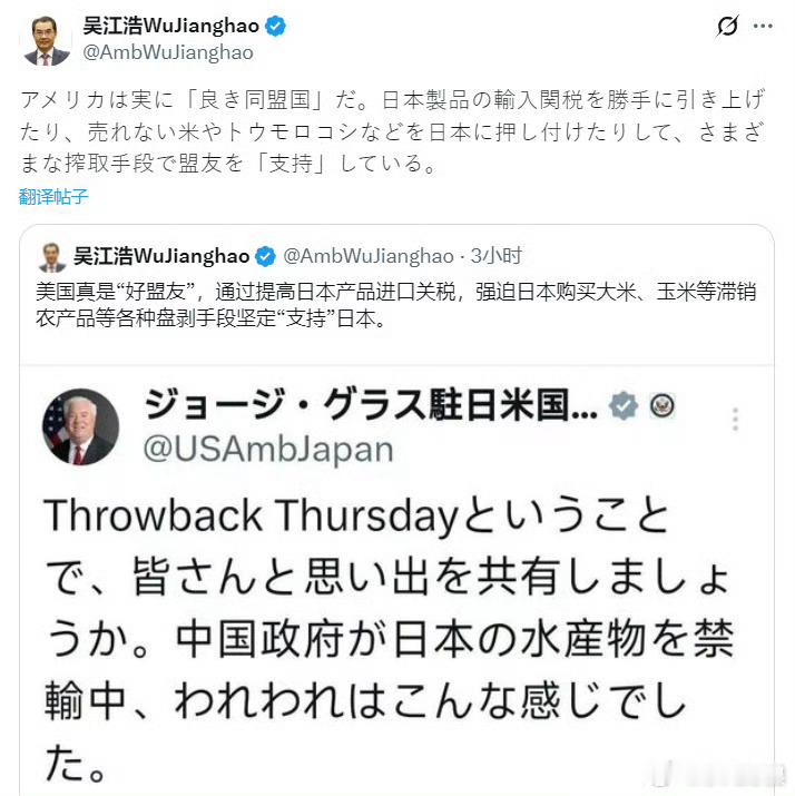 中国驻日大使吴江浩:美国真是“好盟友”,通过提高日本产品进口关税,强迫日本购买大米、玉米等滞销农产品等各种盘剥手段坚定“支持”日本。