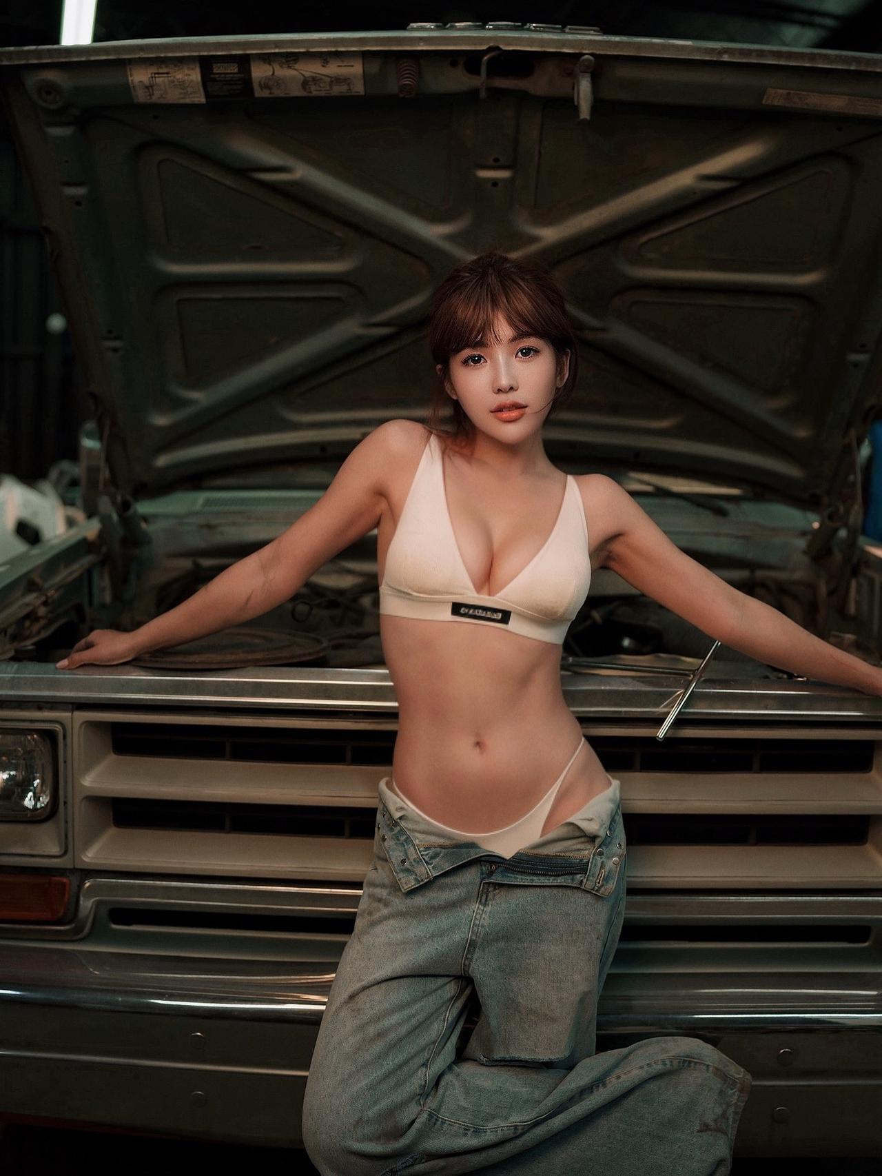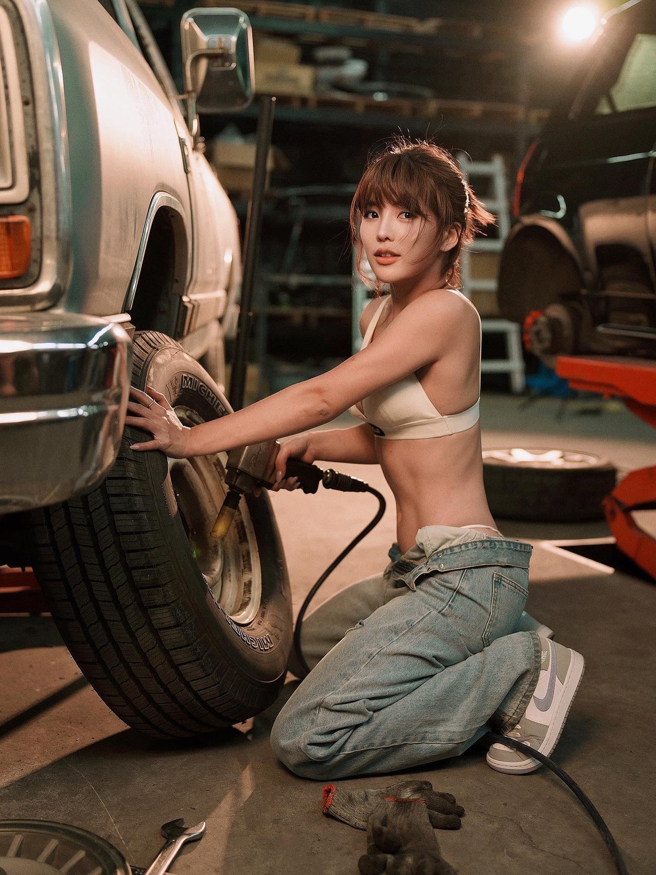 穿比基尼的修车女工,好美的小姐姐! 模特:台湾啦啦队员壮壮