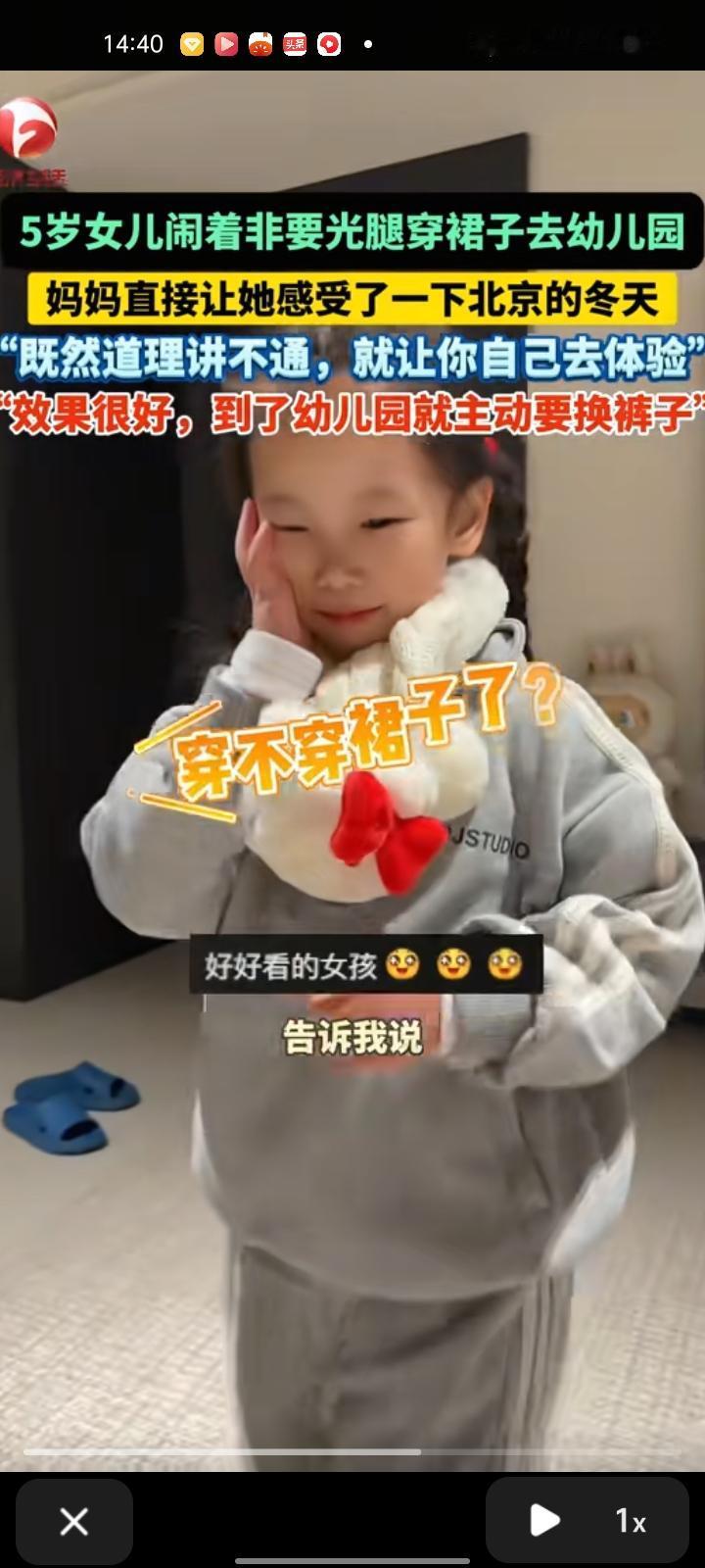 11月20日,北京。高女士晒视频表示,女儿非要穿裙子光腿上幼儿园,撒泼打滚,跟她讲道理都没用,直接让她体验北京的冬天,自己则是和老师说提前准备好了裤子。 高女士还没到家,老师就主动发来信息,女儿到了幼儿园主动要求穿裤子,这方法果然好使。