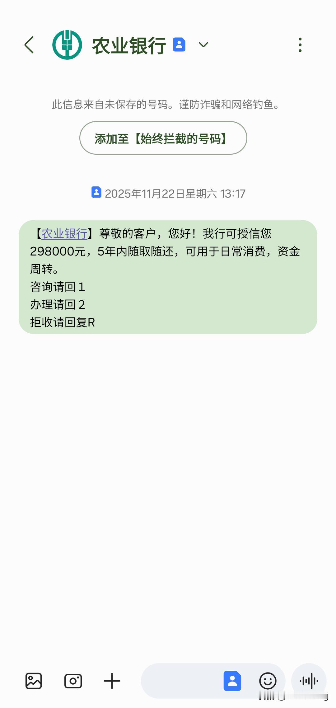 我有个问题啊,为什么这些所谓的银行真正的银行的部门怎么不管一管呢?我本人并没有农业银行的银行卡,即使我有农业银行的银行卡,根据反洗钱法,我的银行卡也不能拿来贷款! 而且根据商业银行法,我是没有办法在没有农业银行的银行卡的情况下,或者是说没有农业银行的户头的情况下,在农业银行贷款的。所以这很明显,这是一个不符合法律逻辑的一个诈骗信息啊,但是这个标志是真的呀。所以请大家注意,骗子也要过年,马上就过年了,也就一个来月的时间。所以骗子为了冲业绩,他是什么事都做得出来!