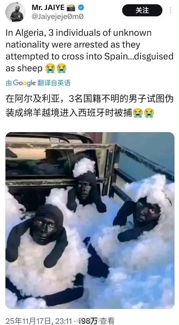 这也行,在阿尔及利亚边检站,工作人员发现了三名伪装成绵羊的偷渡人员,试图进入西班牙。 不得不说,能想到这个主意的也是天才,尤其是那两只长耳朵,躲在羊群中还真不容易发现。但那张黑脸太出彩了,怎么没想着化个底妆呢。 不过也有人说,欧洲人看羊喜欢先看屁股,看不到肥肥羊尾油的屁股,一下子将他们暴露了!