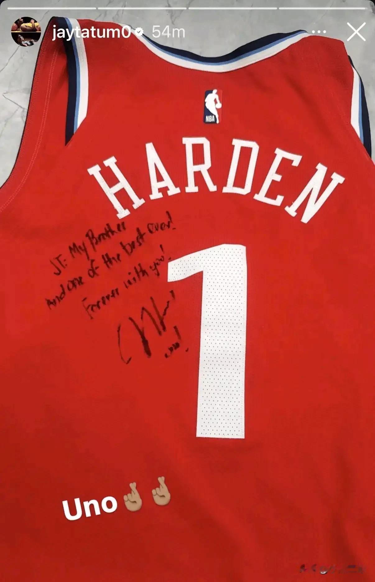 塔图姆社媒晒哈登赠送他的签名球衣:“致杰森-塔图姆,我的兄弟、也是最佳球员之一,永远支持你。”