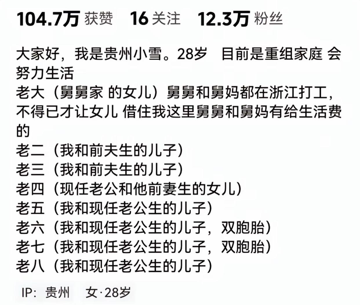 年仅28s岁带着8个娃?简直不要太离谱。刷到一位博主带娃的日常生活,真是不看不知道,一看吓一跳。只见博主的个人简介内排满一列孩子,这8个娃里只有两个不是她亲自生的,最大的女孩是舅舅的女儿,舅舅两口子在浙江打工,把女儿放在小雪家里寄养,其次就是老四也不是她亲生,是她现任丈夫和前妻所生。剩下的6个全是她生的。 而她的视频可以得知,她最小的儿子老八刚出生,当时她肚子里怀着老八的时候,还经常背着一岁半的老六和老七做家务,给其他几个孩子做饭,一个挺着大肚子操持着整个家庭。 更矛盾的是,你说她家没钱吧?她视频里说老公做生意,她自己之前还开店卖炒粉的。可你要说她有钱吧?一大家人挤在她口中2平米的卧室里睡觉,为了容纳多人,还把卧室分隔成了三层。 身体方面,一连生了六个孩子,气血还这么好。老八刚剖腹产出生6天,她就和老公大吵一架带着老八搬出去住了,坐月子第十天就在家里上爬下摸打扫卫生。这简直给网友们看麻了,不少网友评论道应该再生一个,刚好九子夺嫡,再生三个,刚好能够参加足球队了。