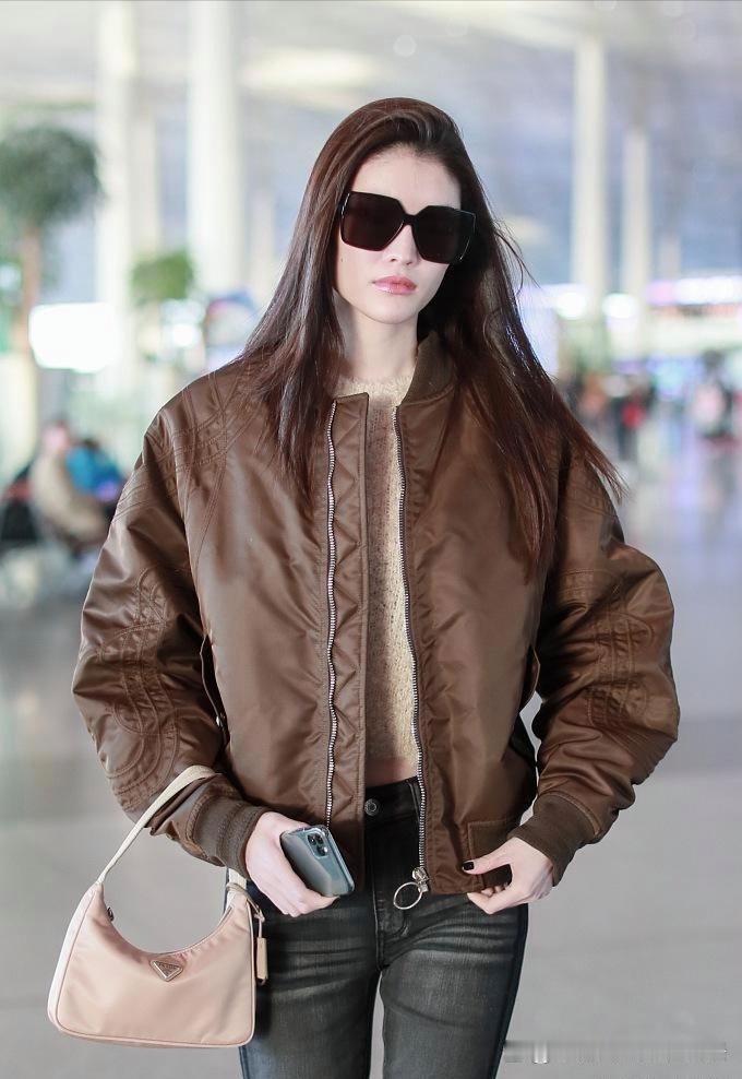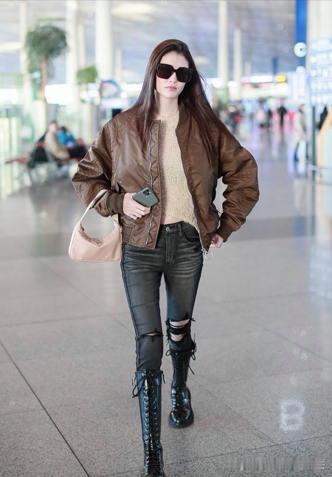何穗穿飞机夹克破洞裤,酷得很,踩长筒马丁靴,气场超强。