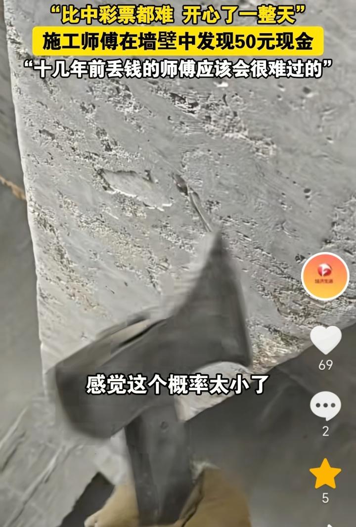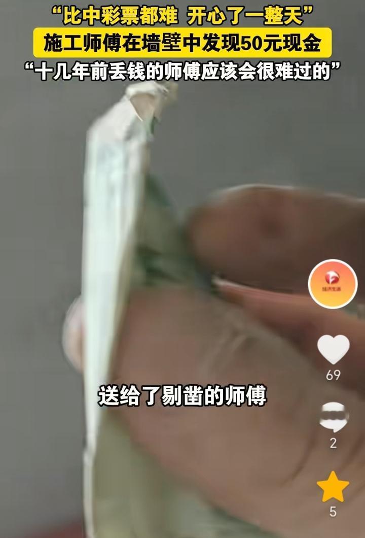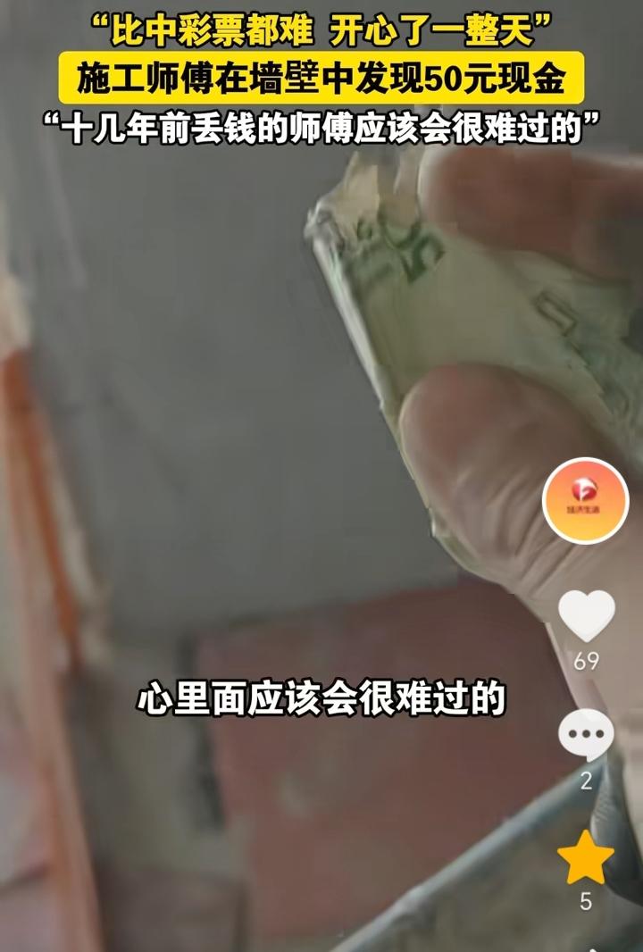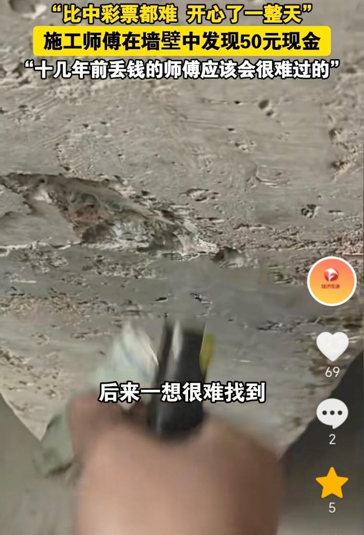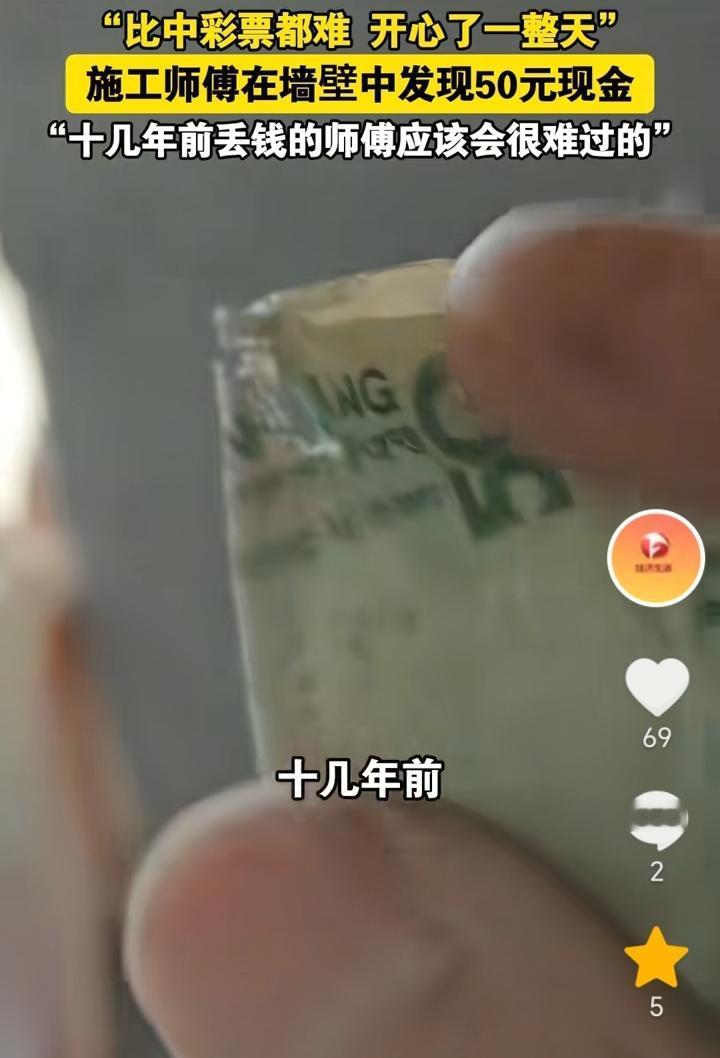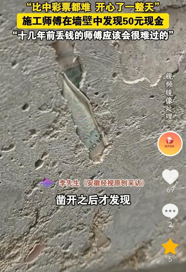 运气逆天了!安徽芜湖,施工师傅无意间发现墙体里面有钱,开始还不相信是钱,抱着好奇的心理把墙凿开后发现是50元钱,施工师傅感觉太幸运了,比中彩票都难,开心了一整天,最开始想着归还失主,仔细一想现在也是很难找到,于是就把钱送给了剔凿师傅,不过想想觉得十几年前丢钱的施工师傅应该也是很难过。 这是运气来了挡都挡不住,谁能想到在墙里面能发现50元钱,这逆天的运气买彩票估计都能中大奖。 施工师傅发现50元钱结果开心一整天,可能当时丢钱的师傅心里也是难过了一整天,忙碌一天赚不到多少钱,结果还丢了50元,看来出门还是尽量不要带现金以免丢失,现在手机支付也是非常的方便。 其实有时候人也是很容易满足的,一件小事可能就会提供情绪价值开心一天。 对此网友们也是纷纷猜测,有网友觉得可能有人故意放的,也有网友觉得可能是施工师傅掏烟的时候不小心掉的。对此,大家觉得呢?
