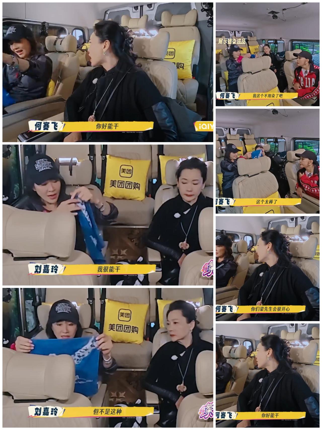 何赛飞这样说, 刘嘉玲明显不高兴了, 看来何赛飞下次不敢 那么敷衍。 刘嘉玲做了一个蜡染巾, 图案是自己亲手画上去。 但是刘嘉玲画工不好, 把白云画成了“猫”。 何赛飞看到刘嘉玲这个蜡染巾, 立刻开启“夸夸模式”, 强调梁朝伟一定很开心, 有这样一个能干的妻子。 一般人听到这样的话, 都会谦虚应付一下就好。 但是刘嘉玲一点都不谦虚, 强调自己很能干, 而且纠正何赛飞, 自己在蜡染及画画不擅长, 而是其他方面很擅长,很能干, 暗示何赛飞没有夸到点子上, 胡乱夸赞。 刘嘉玲知道自己这个蜡染巾的图案画“砸”了, 在何赛飞口中却被夸上天了。 哎呀, 何赛飞这样不走心的“夸夸模式”, 对于一般人是非常受用的, 但是面对眼里容不得沙子的刘嘉玲 就不管用了。 就算对方是好心夸自己, 也要纠错。 太较真了。 她们都没有错, 几十年的待人处事方式 各有不同, 各有各魅力。 相比何赛飞的见什么都夸, 我更加欣赏刘嘉玲的直爽 与“较真”