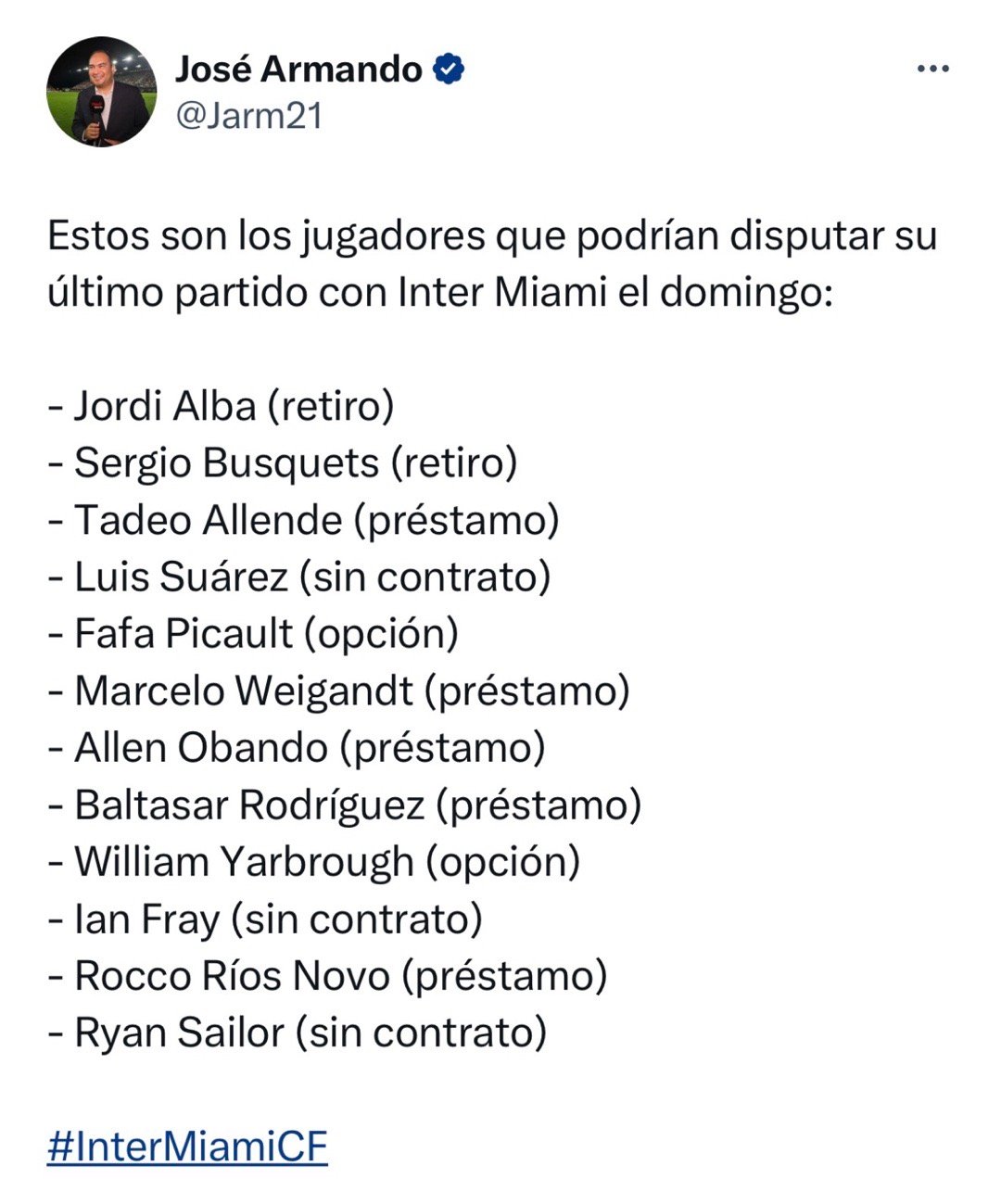 🚨如果对阵辛辛那提的比赛被淘汰,以下这些球员可能在本周迎来身披迈阿密国际战袍的最后一战:阿尔巴(退役)布斯克茨(退役)苏亚雷斯(合约到期)伊恩·弗雷(合约到期)瑞恩·塞勒(合约到期)罗科·里奥斯·诺沃(租借期满)阿连德(租借期满)魏甘特(租借期满)阿伦·奥班多(租借期满)巴尔塔萨·罗德里格斯(租借期满)法法·皮考特(合同选项)威廉·亚布罗(合同选项)