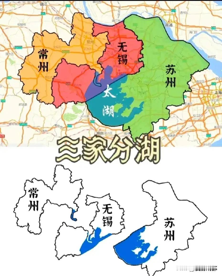 太湖的划分很有意思,太湖面积约2400平方公里,苏州占比约70%,无锡占比28%,常州1.7%,而以太湖出名的湖州竟然只保留了沿岸50(或70)米的沿岸关怀,基本被江苏占据! 常州伸进太湖一只脚,主要是因为太湖中有两个小岛焦山⛰️和小焦山属于常州管辖,使常州有了管辖太湖的权利,但也因此使无锡的宜兴与无锡主体分开,成为无锡的飞地! 历史的惯性很强大,以前不在意就造成了现在的结果,但想改就很难了,毕竟太湖是一个金元宝,谁都不想放弃到手的肉!